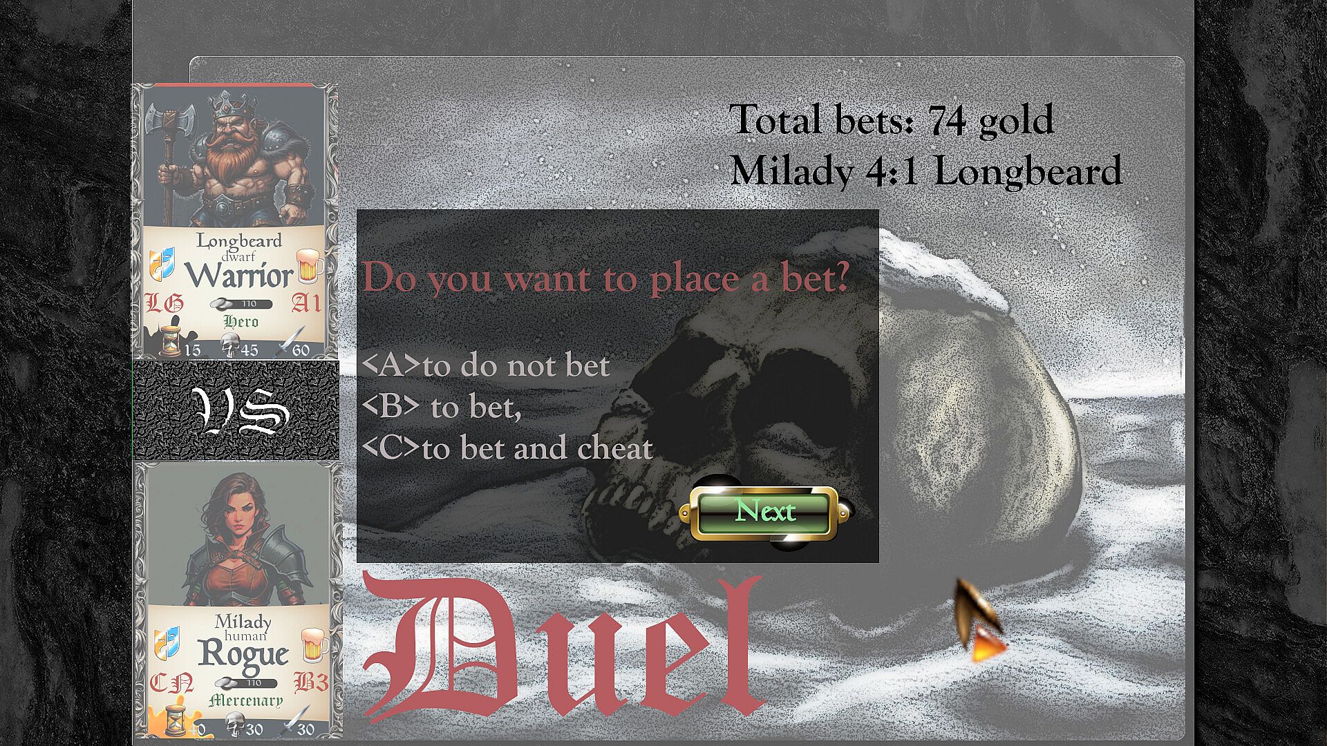 From brawl to outright battle passing by discrete assassination, each hero has its own unique way to deal with such situation. You will have to learn to deal with it too, and you might even earn a little coin by betting on the outcome.