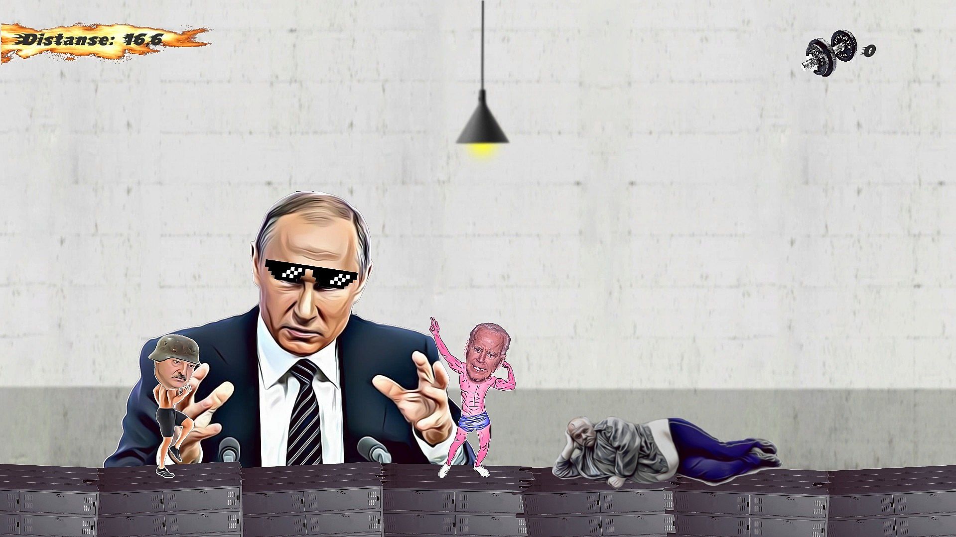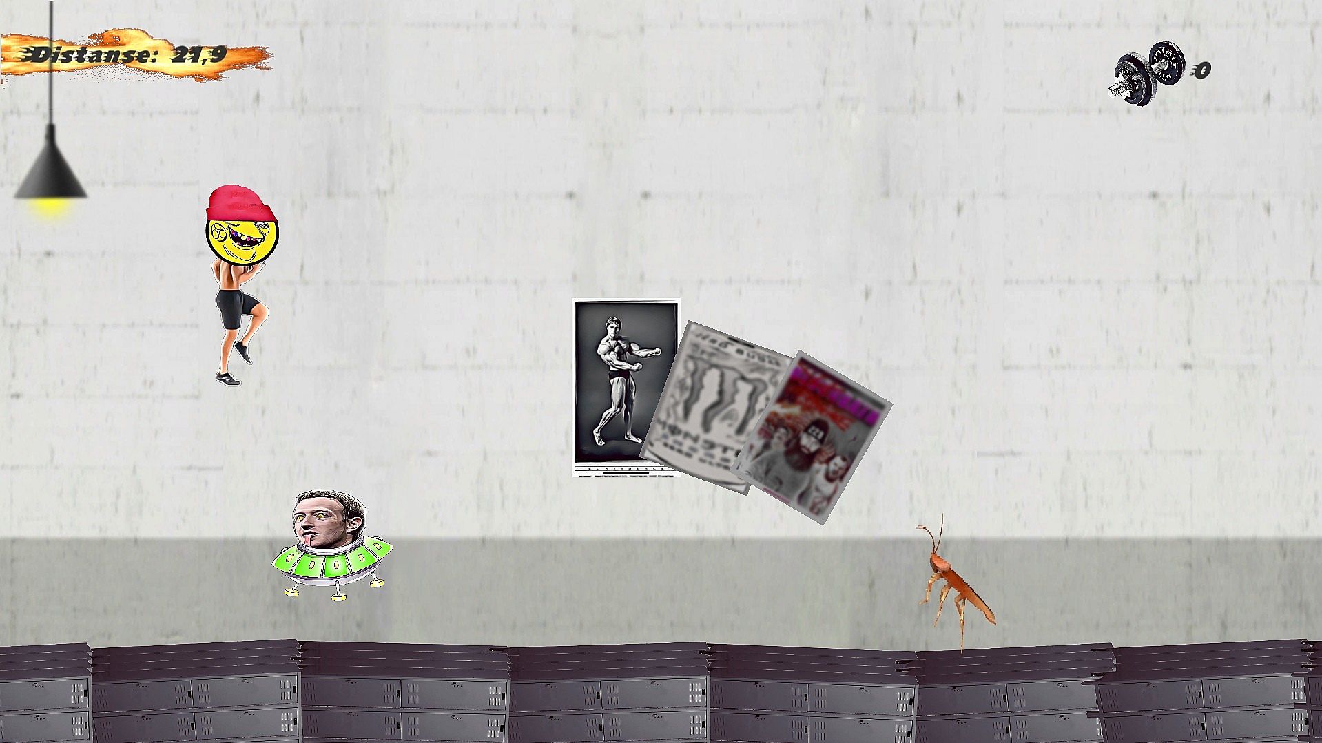You start as a weakling, with a cheap car and no drinks to help you. Collect weights to exchange them for some tonics and a new ride. Upgrade yourself by buying masks which will increase the amount of weights you gain.