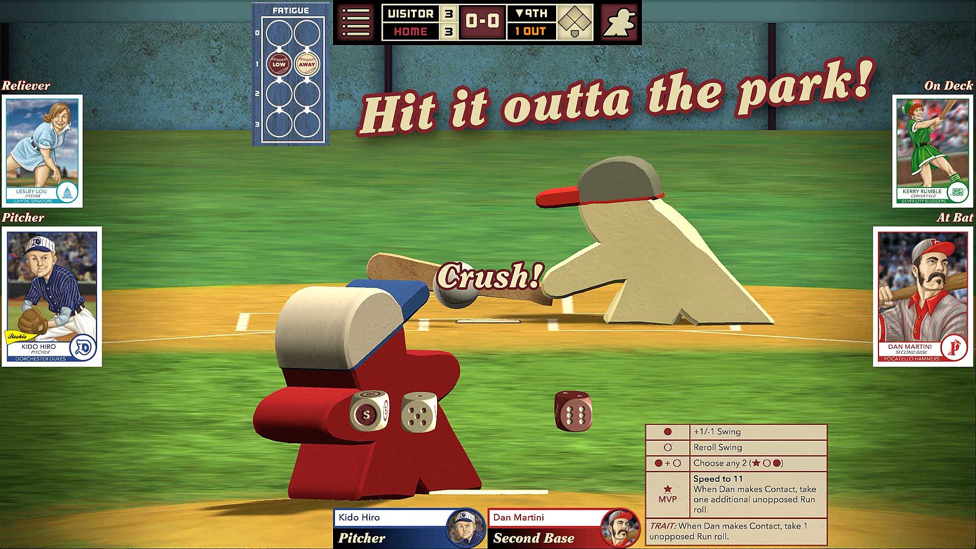 Bottom of the 9th is a strategic 2-player baseball game played with cards and dice. This faithful adaptation brings the fast-paced fun of the tabletop game to your computer! Choose your lineup from a pool of players with different strengths and abilities, outsmart your opponent in the stare-down, then roll the dice to trigger the action.