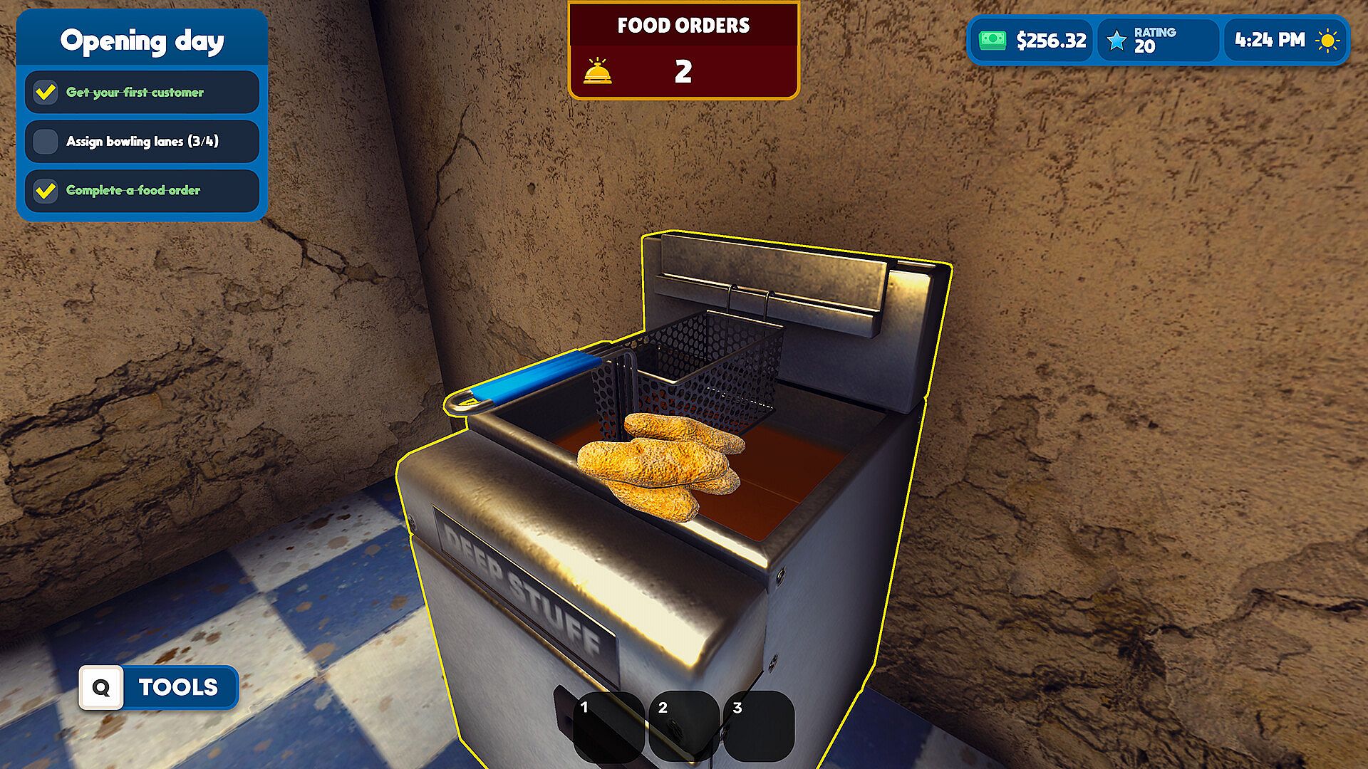 • Hire staff to run lanes, cook food, and clean the alley