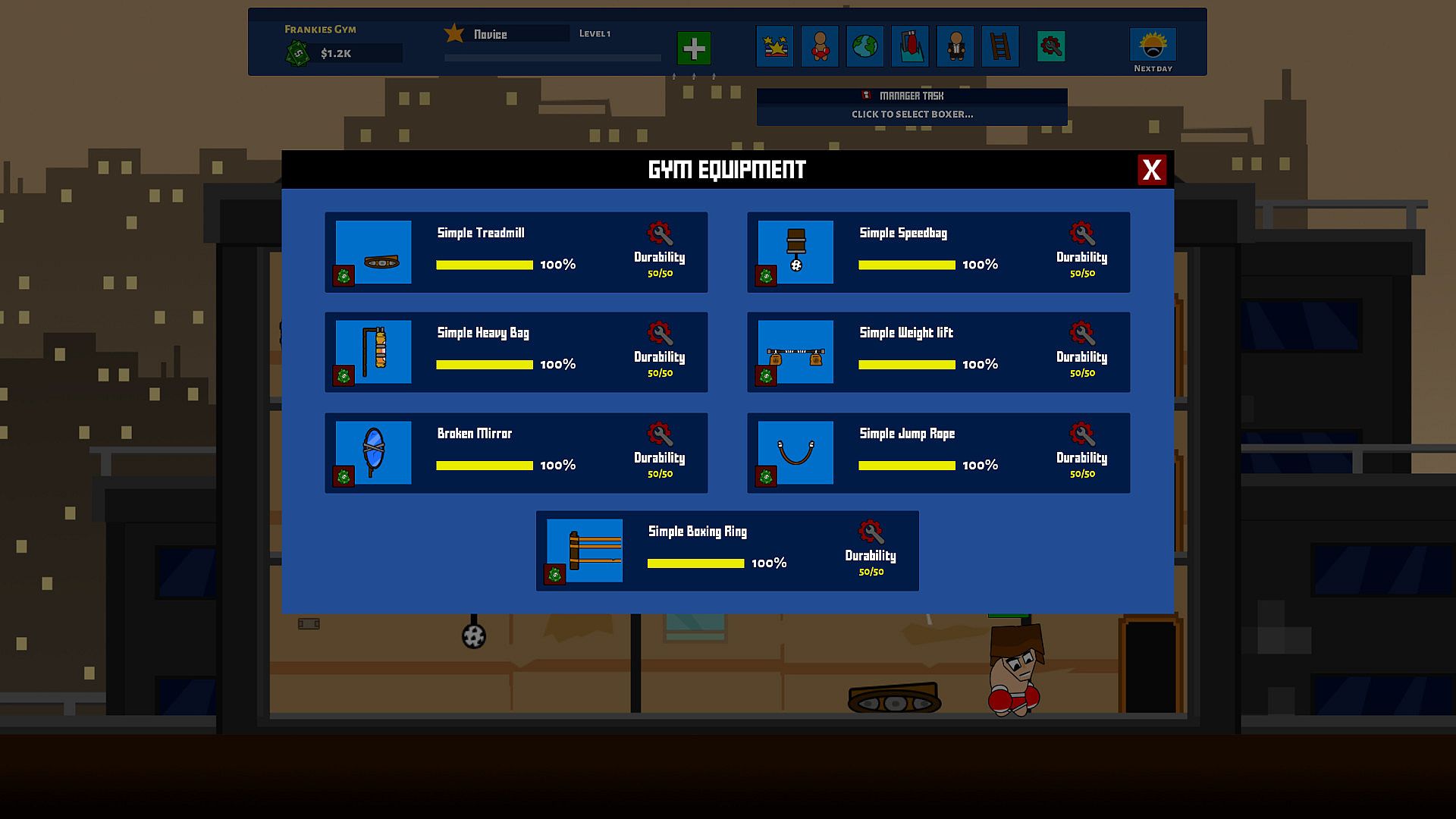 • Buy, upgrade and manage gym equipment.