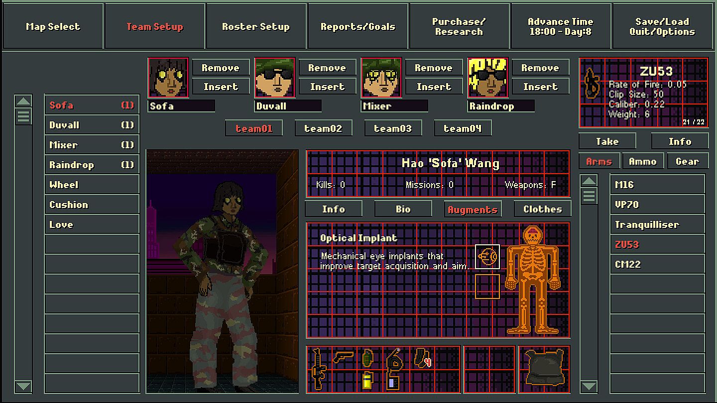 Between missions change gear, equipment, and weapons to match the needs of the job and your plans. Graft enhancements onto your agents in the lab creating an unstoppable super soldier or an expendable glass cannon.