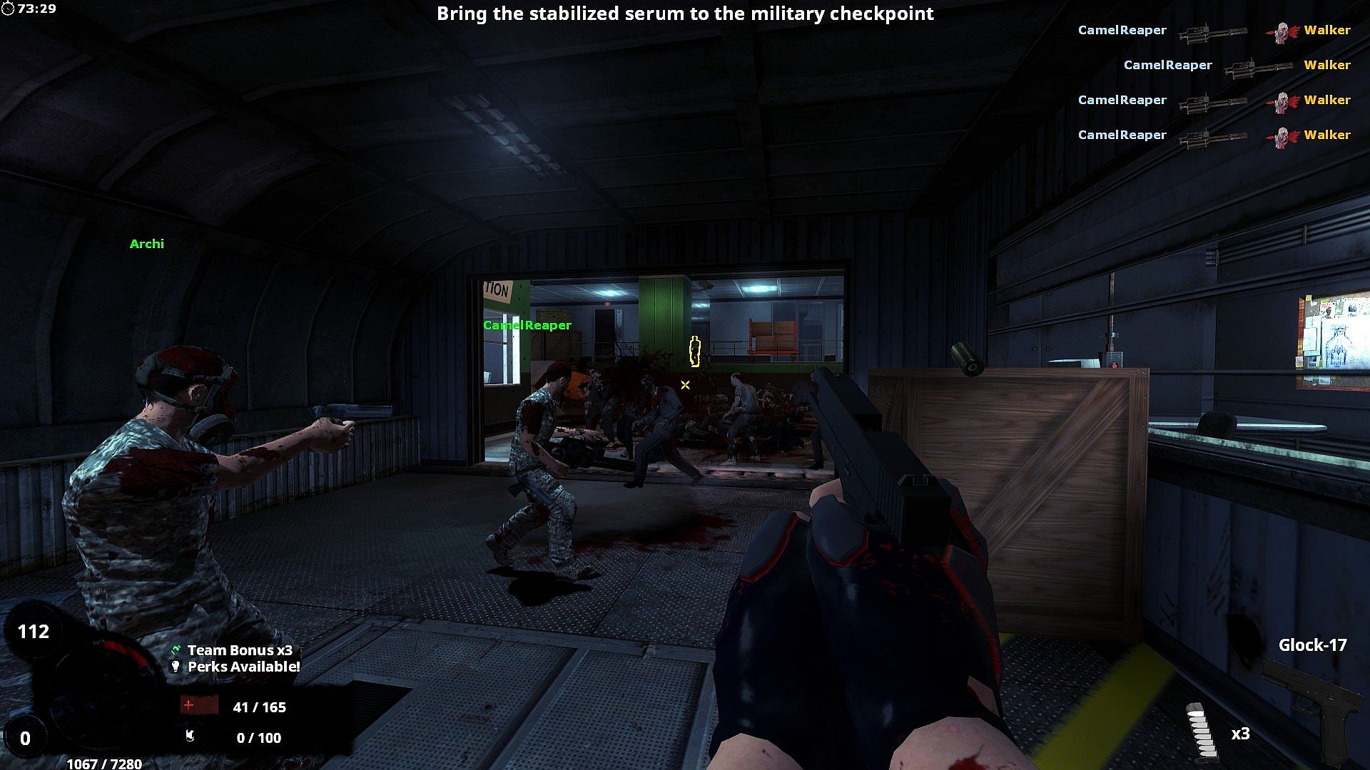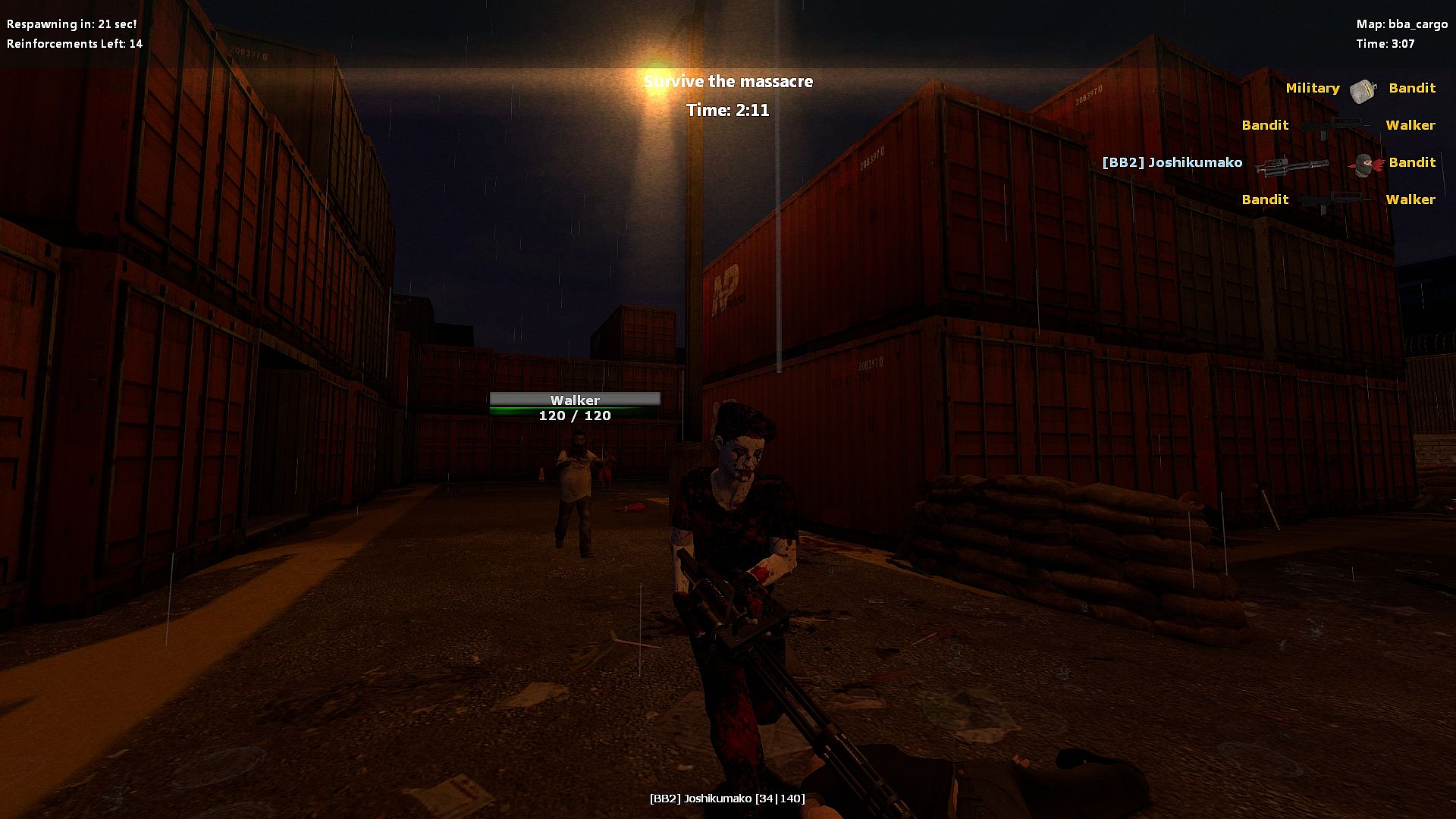 Focuses on small & simple objectives, this is a casual/chill gamemode based on the original BrainBread, if you want a pure BrainBread experience you can enable a server command to force it to vanilla BrainBread mode. In this mode you can also play as a zombie and as a human you can get infected. The zombie's objective is to prevent the humans from progressing, when you get a certain amount of kills you will be able to respawn as a human again, or if you die too many times. All of this can be regulated by the server owner.