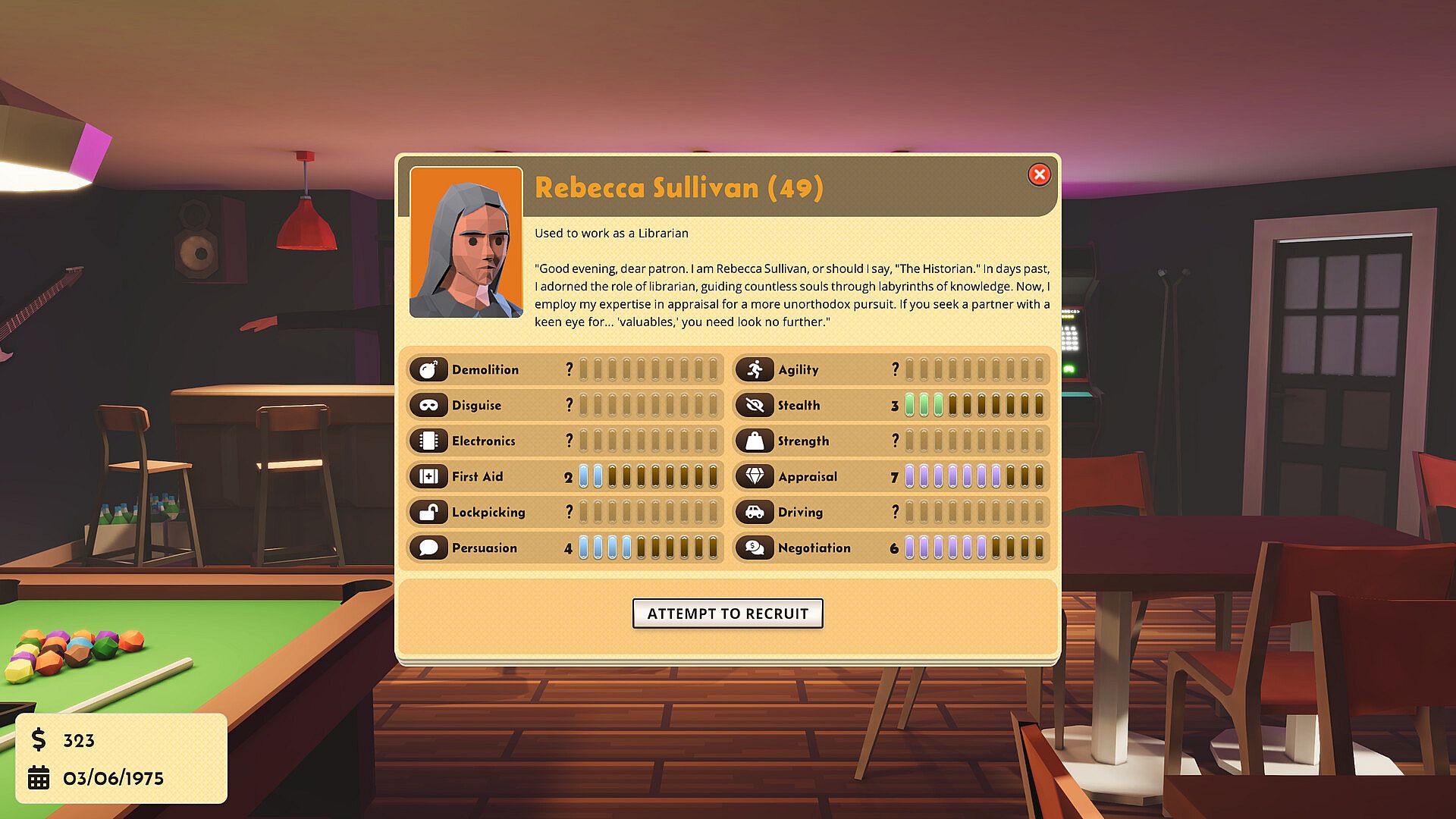 Skill progression: Evolve your character's skills through hands-on experience. The more you pick locks, sweet-talk guards, or fence stolen items, the better you become. Your success depends on your expertise! Stealth, agility, strength, electronics, driving, first aid, disguise, persuasion, demolition, lockpicking, appraisal (to avoid selling a Picasso for the price of a pizza), and negotiation. All these skills are at your disposal. Make the most out of them!