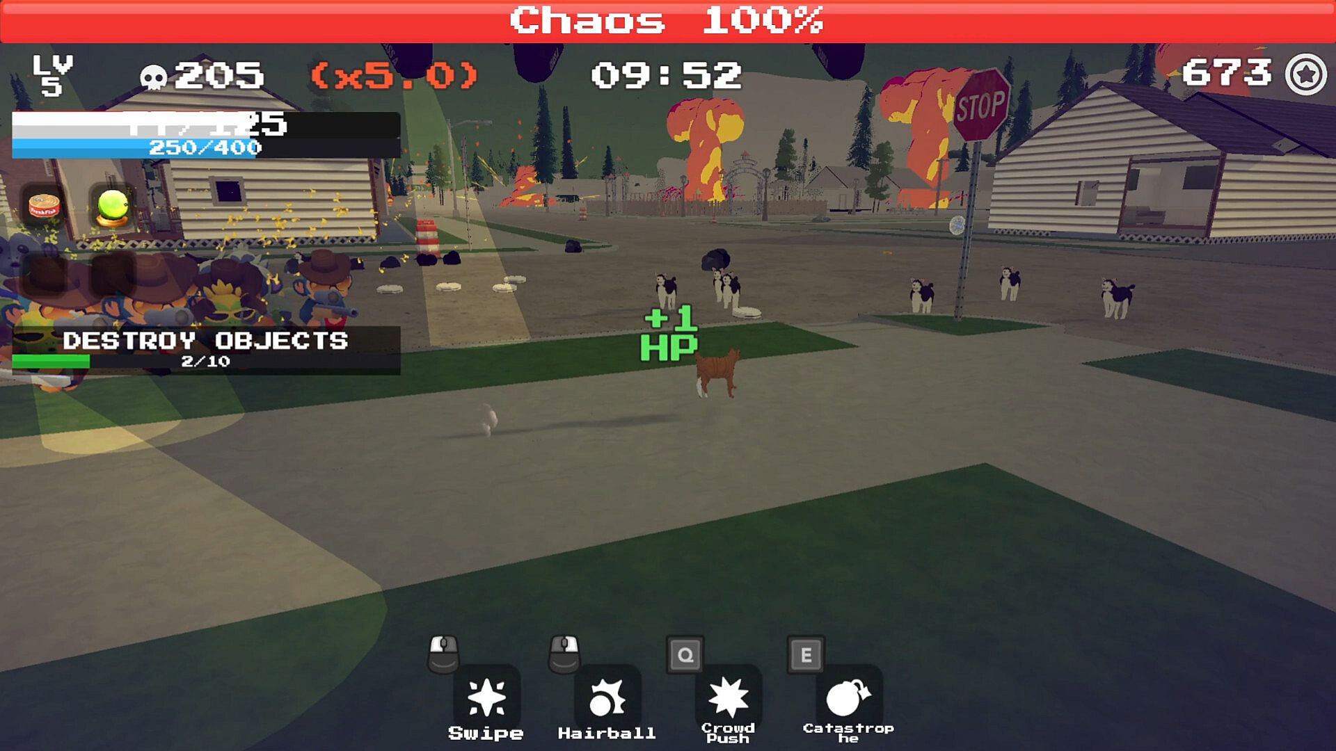 You play as an unhinged cat (and other unlockable weirdos) dropped into fragile, fully destructible worlds.