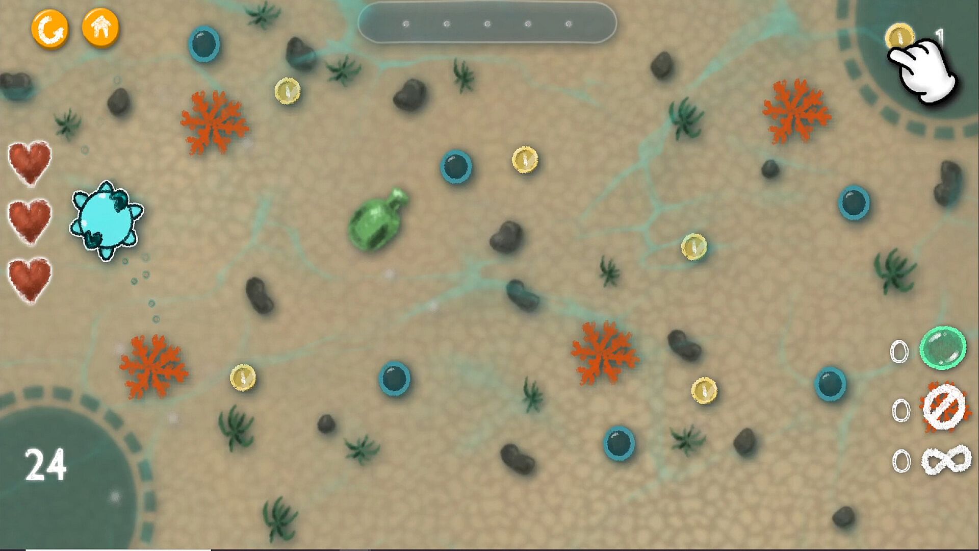 The main aim of each level is to collect 5 bubbles and get to the shell where Blubi lives. First it is easy to do, but soon come handicaps and enemies.