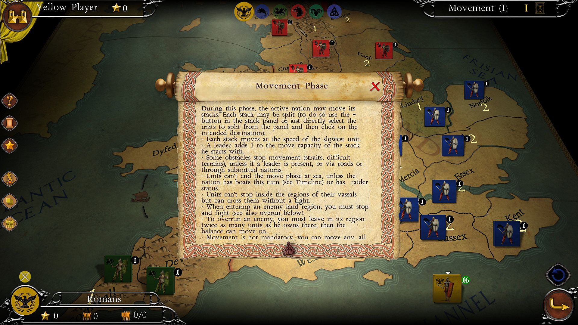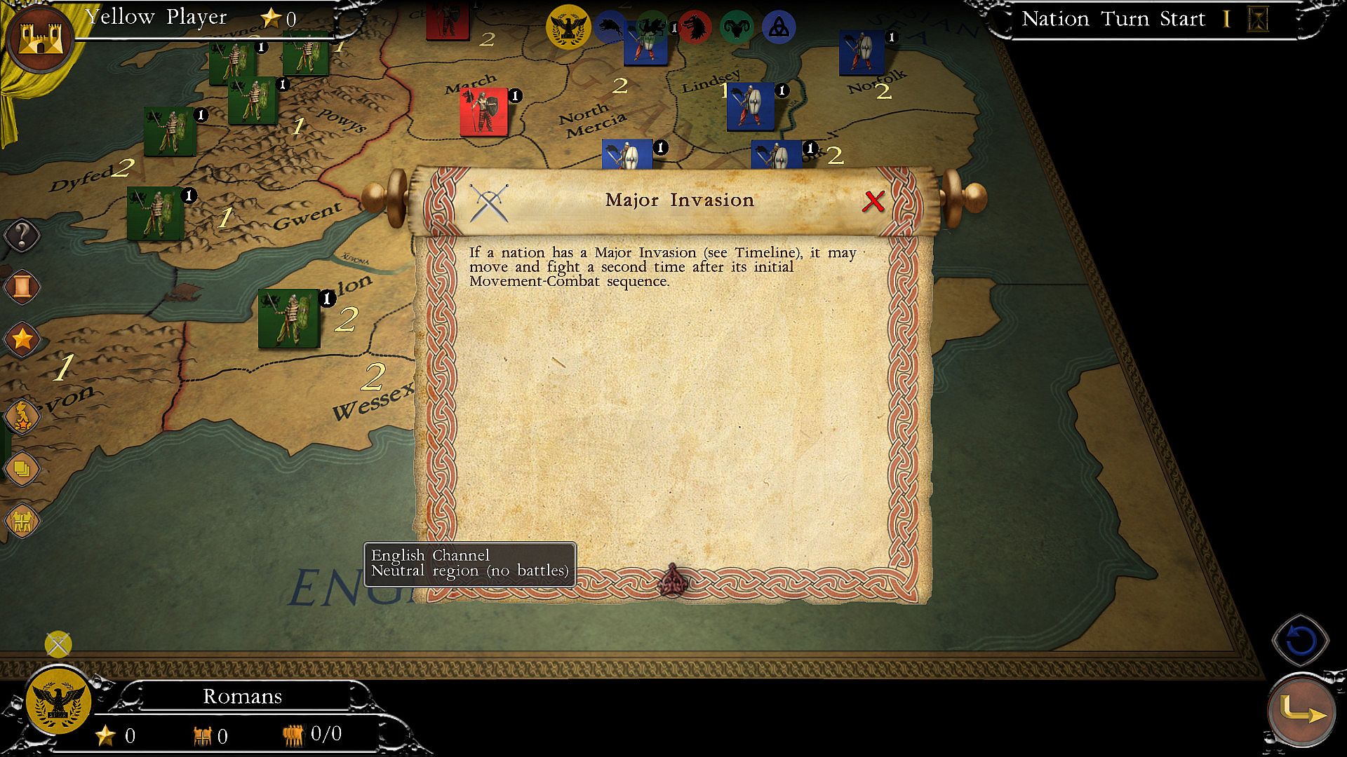 Playable offline with 1 to 4 players across 3 scenarios, including the Roman invasion of 43 A.D., the 5th-century Germanic invasions, and the invasions from the North (by Danes, Vikings, and Normans) until around 1066.