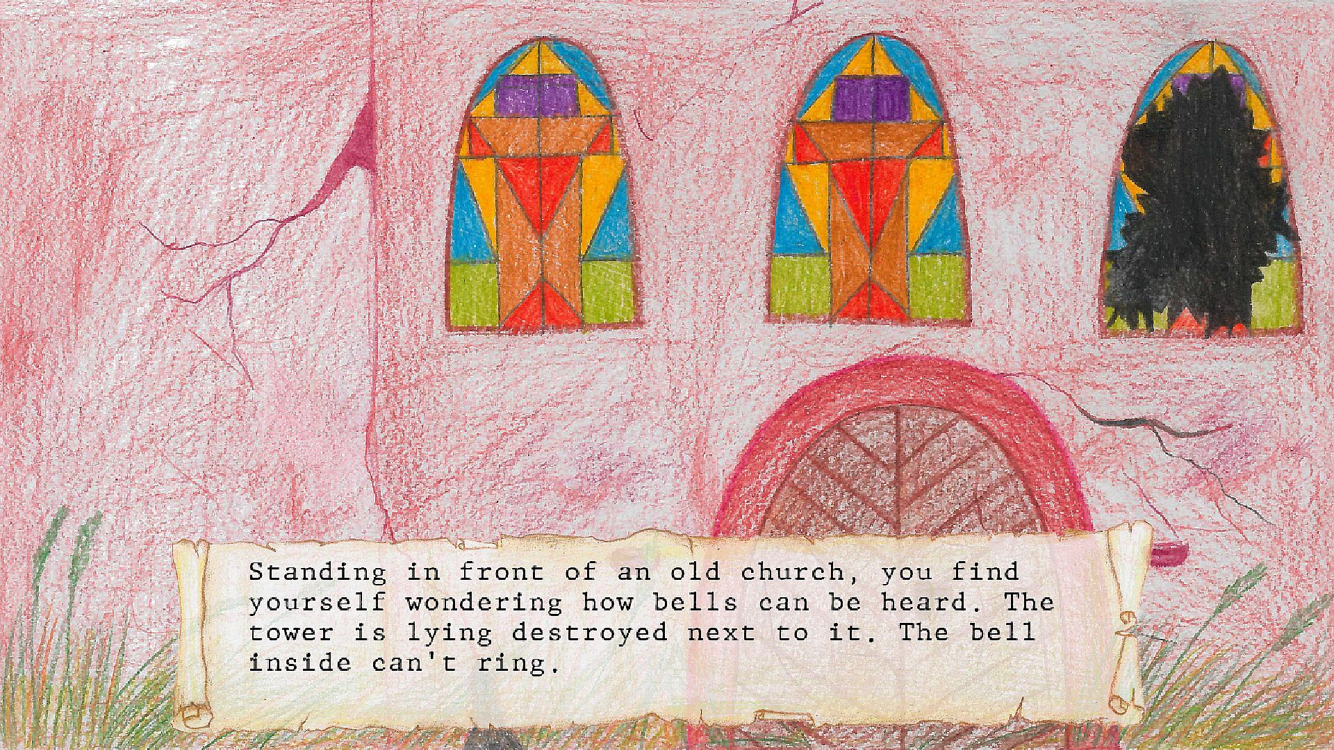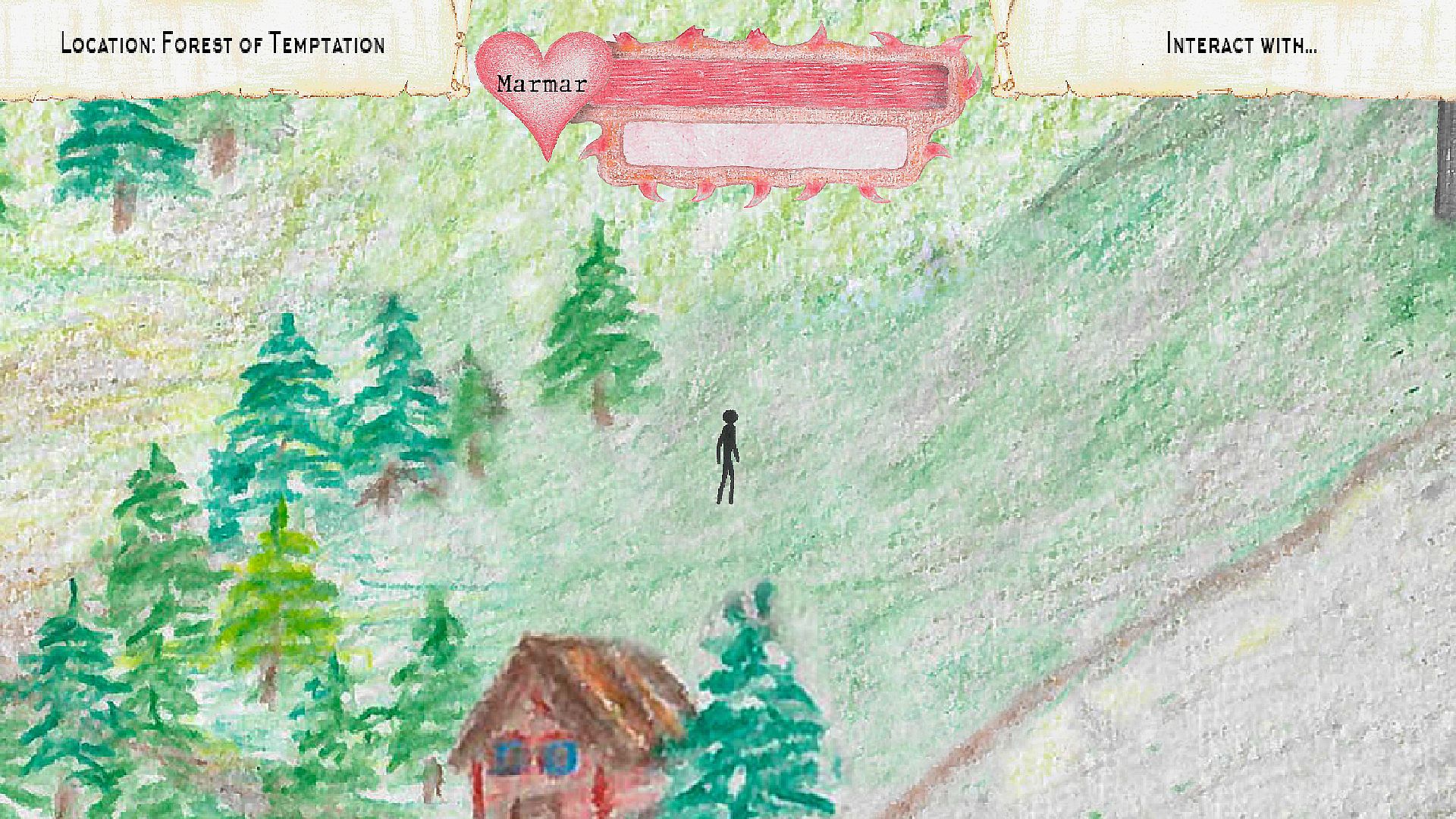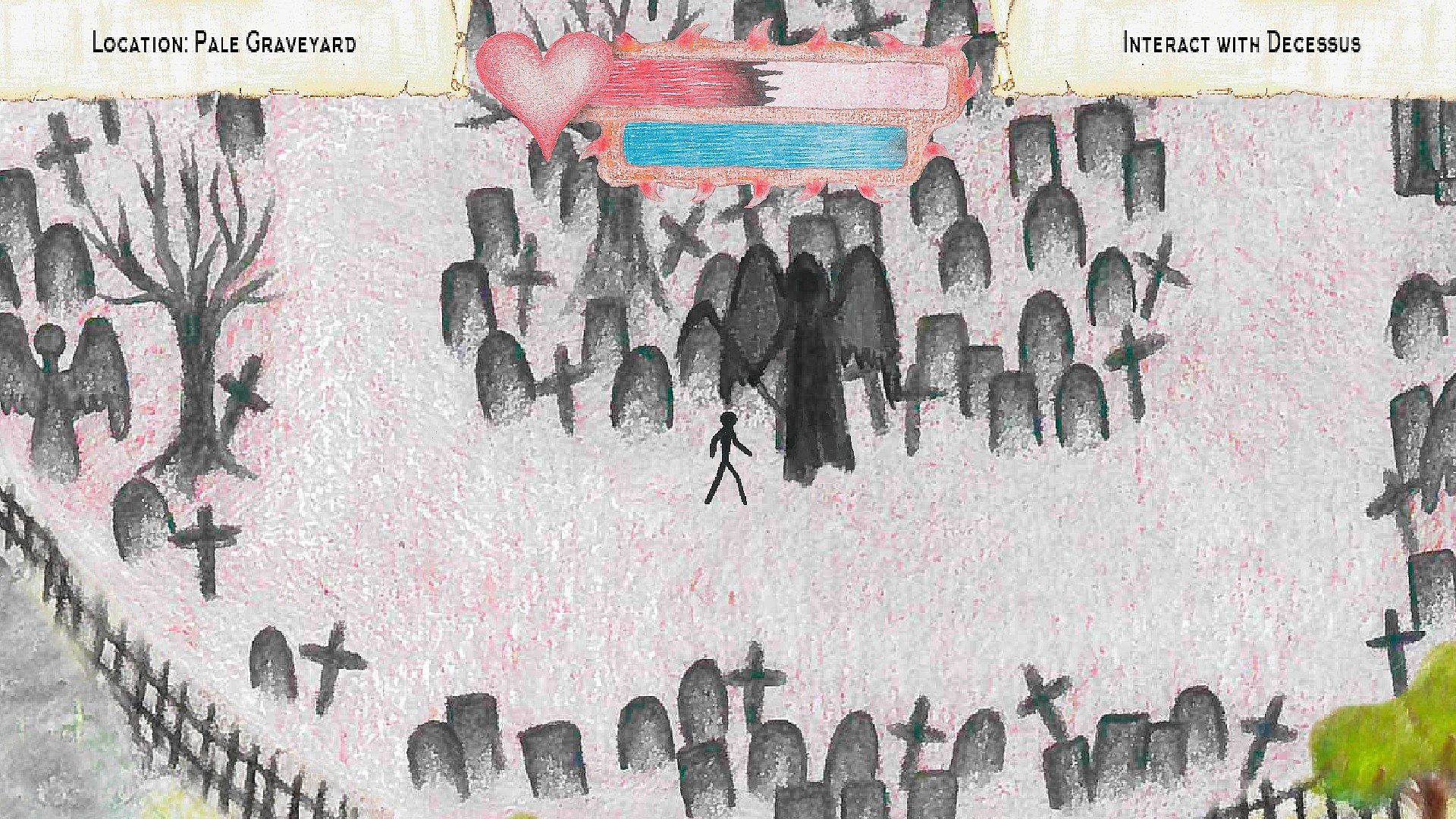 Everything(except text) is hand-drawn with colored pencils on paper, scanned and imported into the game, making it a game with graphics like no other.