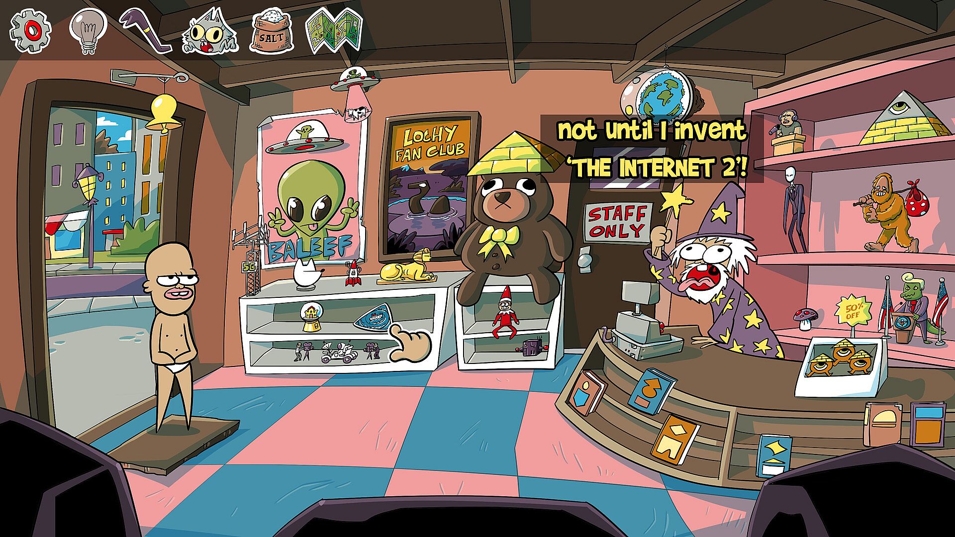 But all of Earth's sugar is mysteriously disappearing, and as you point and click yourself deeper into the seedy under, mid, and top belly of Kifftown, Bru will uncover a conspiracy that goes even deeper than his underpants.