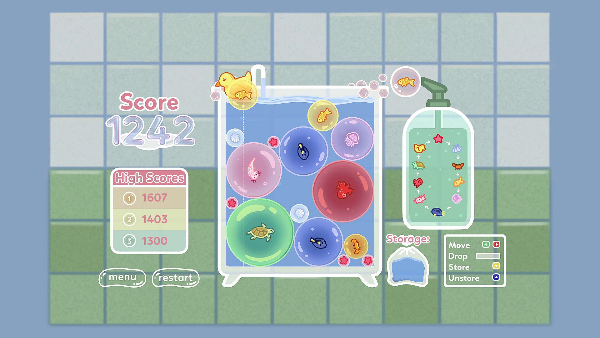 With a humble soap dispenser, now named the Bubble Maker, take the oceanic hostages and cast them into the duck’s porcelain domain. In this tub, the duck loves to play with his bubbles for hours. When two creatures of the same type collide, they become something stronger. Something more powerful. Something exceptional. These discoveries fuel the duck’s obsession. How far can you and the duck go?