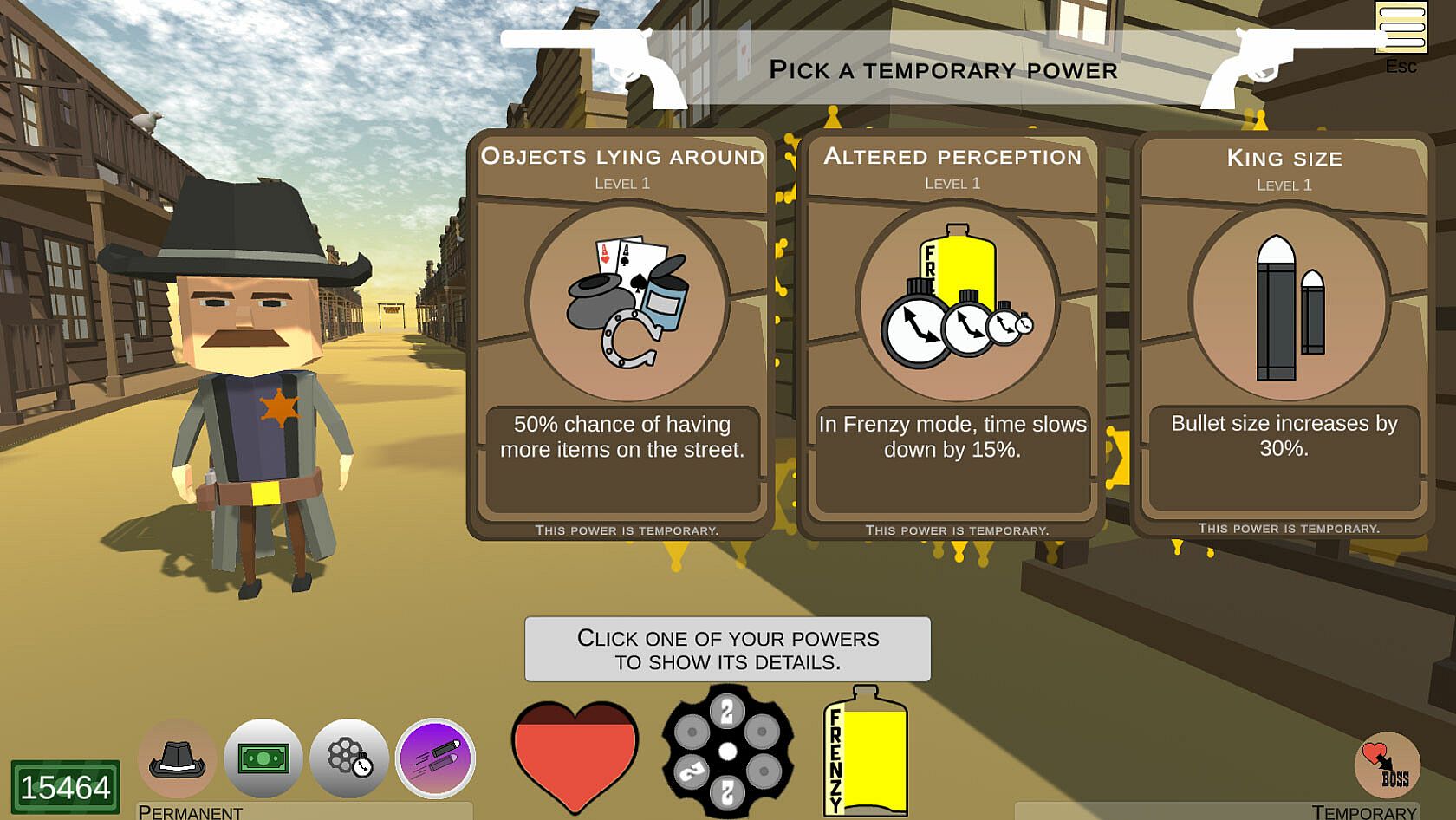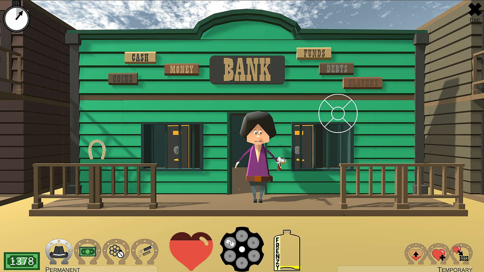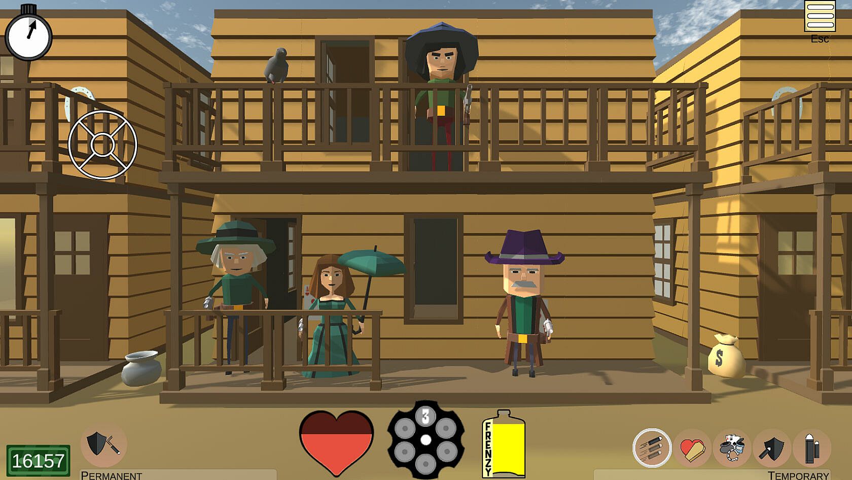 • Ever-changing tactics: Choose your targets wisely and set your priorities right. Should you take care first of the gunslinger threatening you with two guns, or pick up this tantalizing bag of dollars?