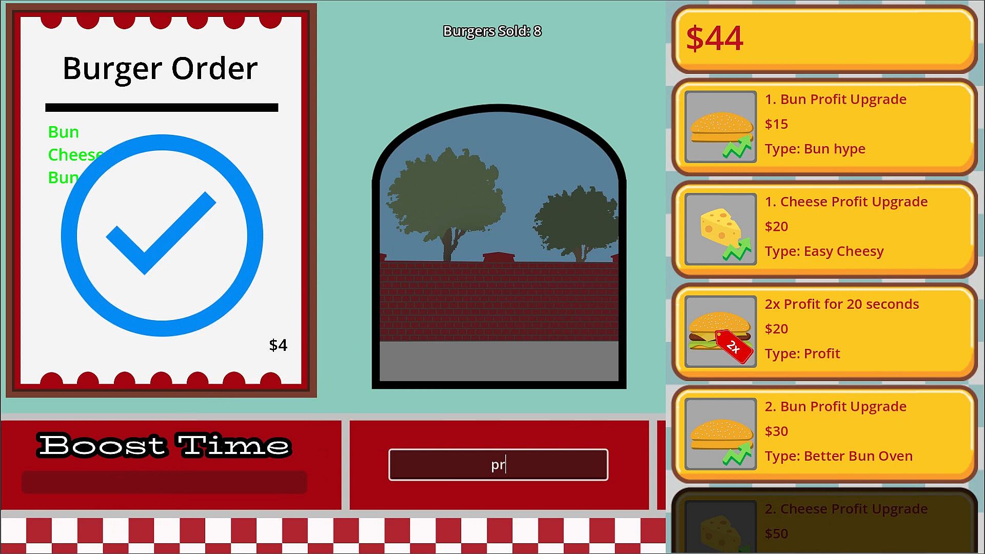 Take orders and prepare burgers in your restaurant by typing ingredients at top speed. Sell burgers to earn cash, raise prices, and chase bigger profits in this indie simulation. Buy upgrades for ingredients and burgers while unlocking new ones to boost efficiency.