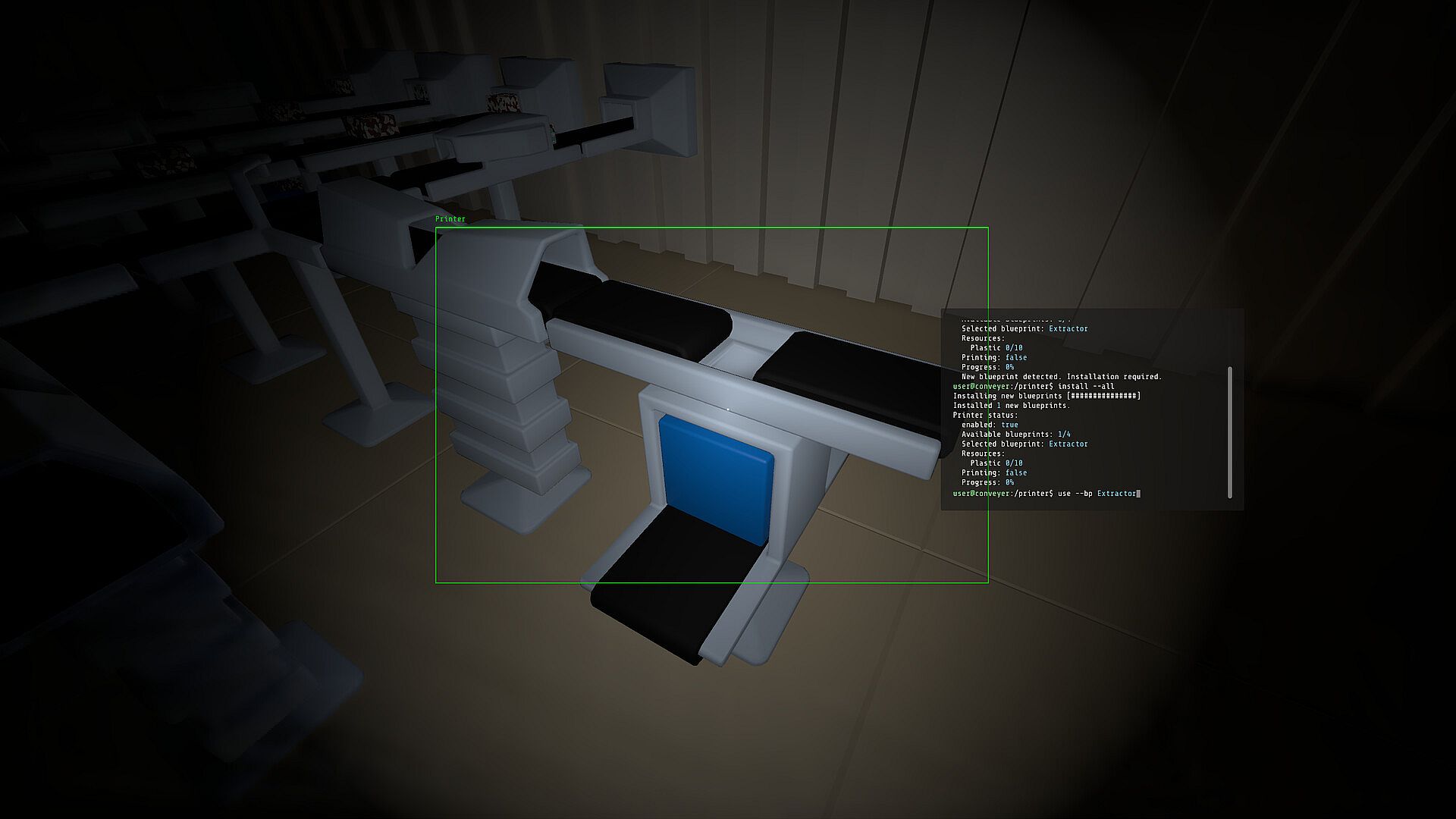 Use realistic terminal commands to connect to conveyor units, printers, extractors, and scanners.