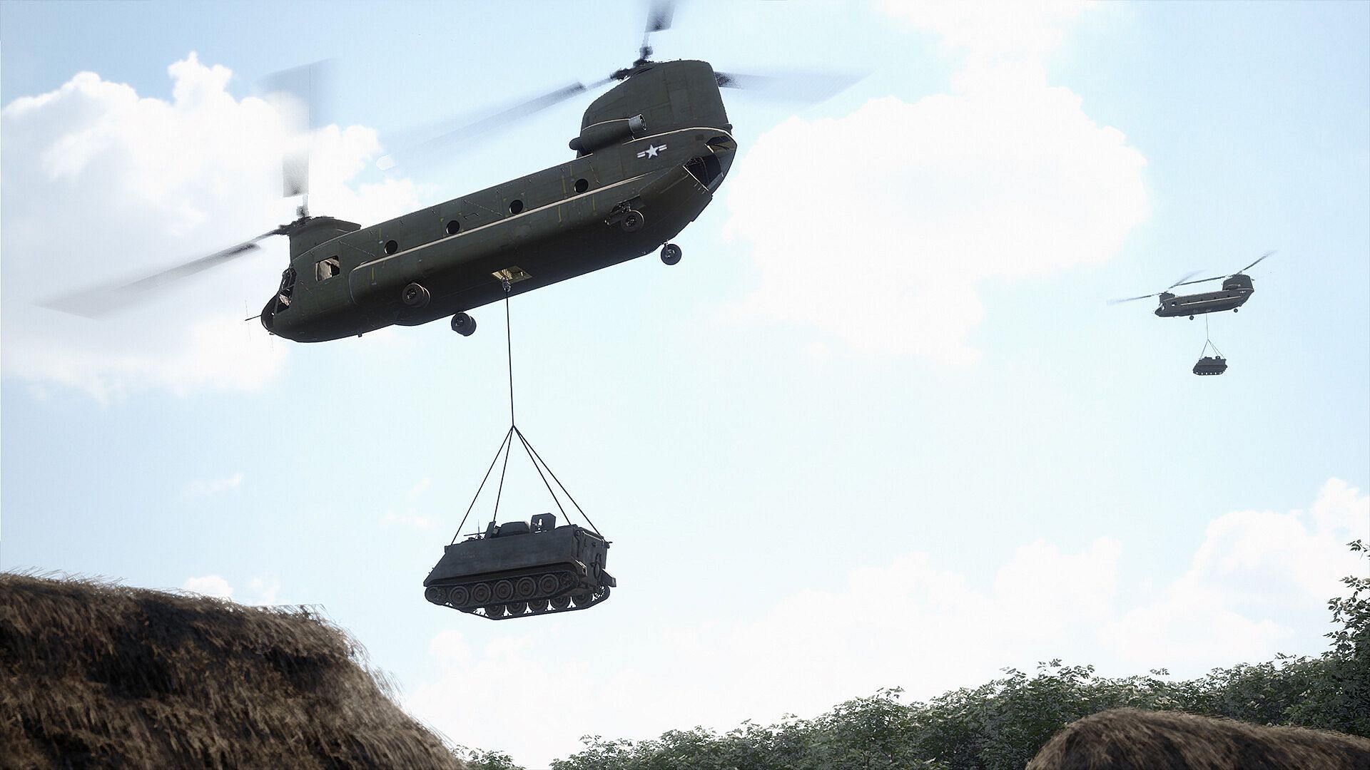 Matches occur on large scale maps of varying sizes, featuring a wide variety of vehicle types that allow players to traverse land, water, and air. Land vehicles include the M151 Jeep, M35 Truck, ZIS150 Truck, light and heavy armor like the M113, M48 Patton and BTR152. Water based vehicles such as the PBR boat and Sampan are complemented by aerial support from helicopters such as the iconic Huey, Chinook and Cobra.
