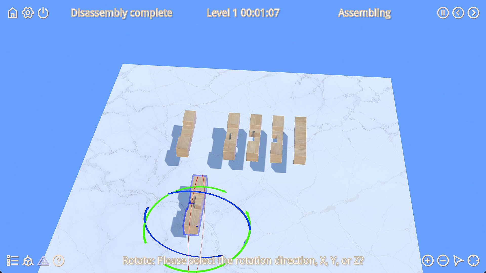 The sticks of the Luban Lock interlock with each other to form a stable structure that does not come apart. Some of the sticks have hollow spaces, so when they interlock, the center of the entire structure is solid. Typically, one complete stick is inserted last to stabilize the structure, thus "locking" it in place; this stick is also referred to as the "locking stick." Opening a Luban Lock is relatively easy, but putting them together requires a certain level of spatial thinking ability and enough patience.
