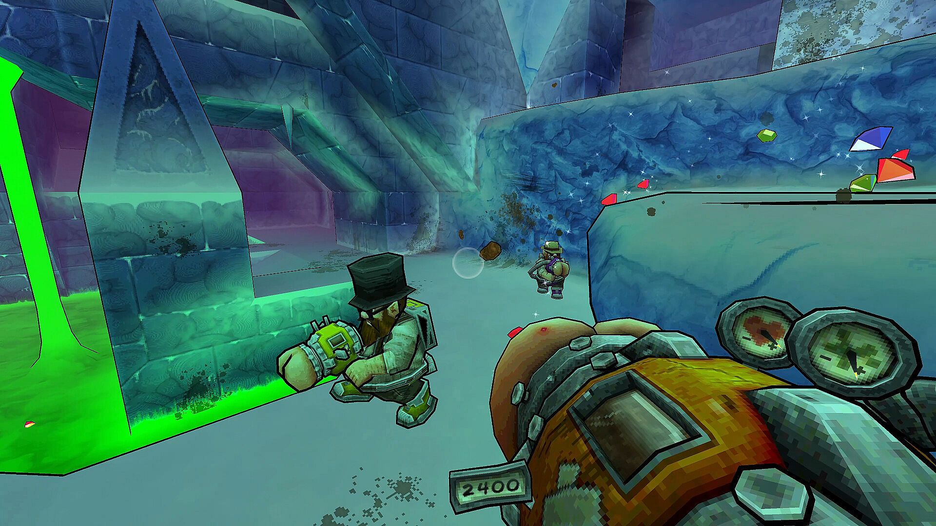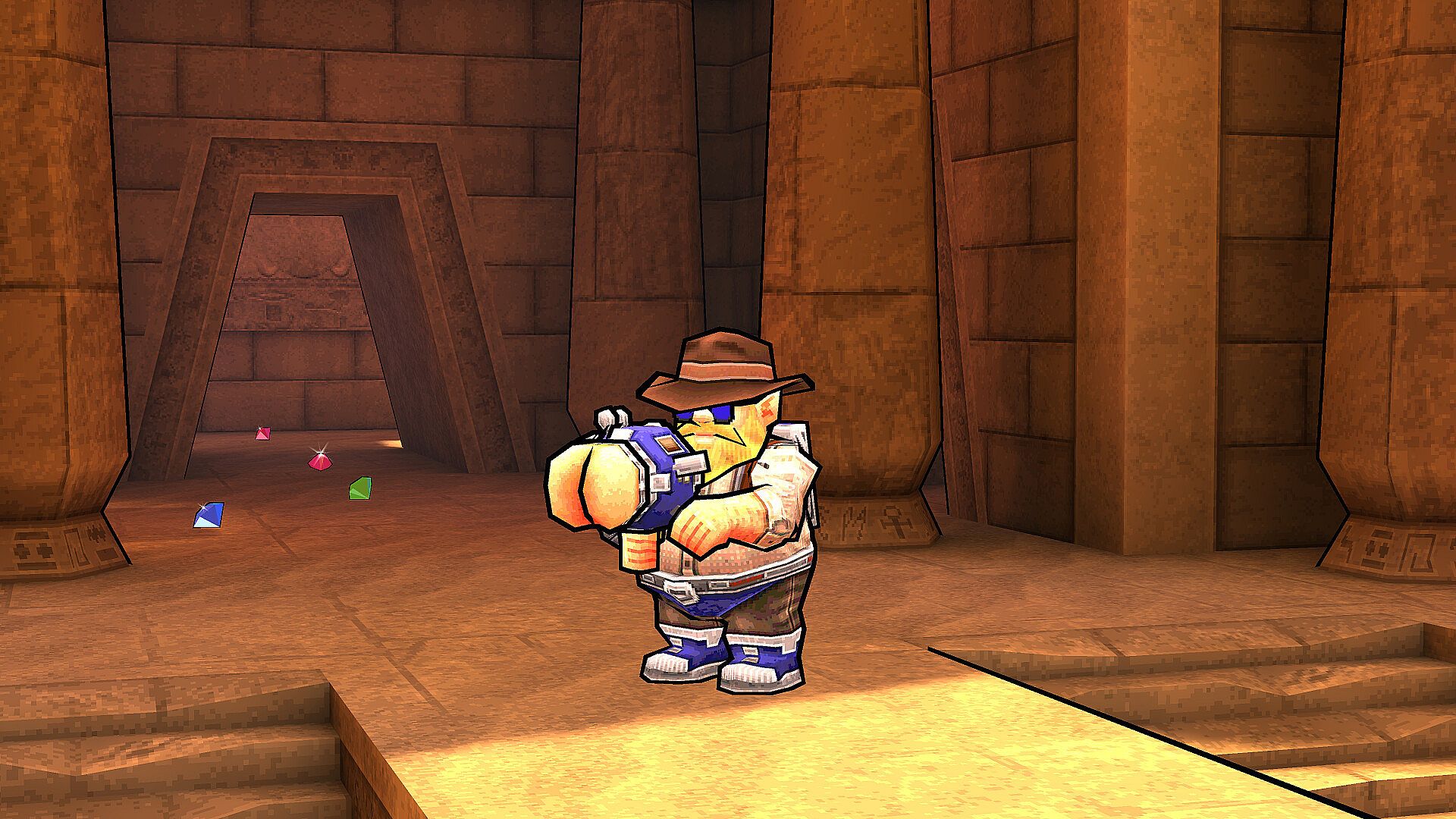Ancient ruins glimmer and glint with gems for you to plunder... but you aren't the only raiding gnome! Turn your butt gun against your rivals and they'll drop their gems for you swipe - just hang tight to yours!