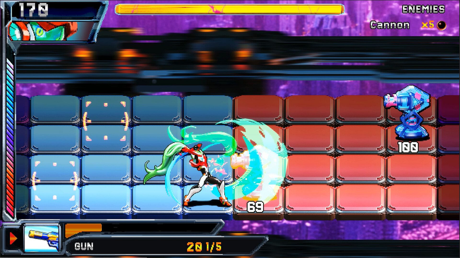 Battles in Bynder ZX unfold in real-time on isometric grid arenas. Movement is your primary weapon. Dash across panels to evade telegraphed attacks, flank enemies, and position yourself for the perfect strike. The battlefield is constantly shifting—mastering spatial effects and hazards is just as important as the cards in your hand.