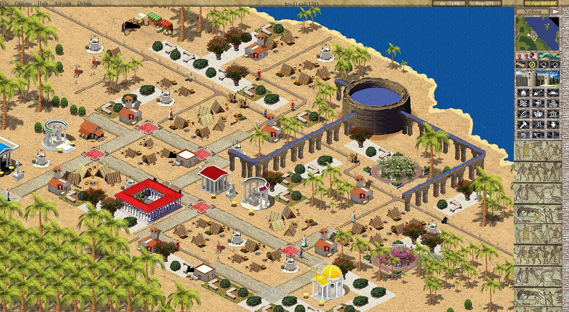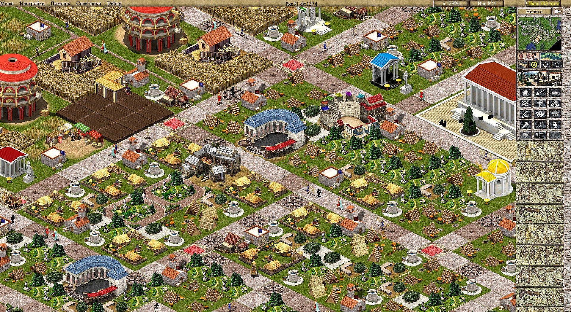 The attitude of the city folk to you will be very important, if the reputation of the ruler is bad it can start the emigration, then criminal rate increases - riots, fires and many other problems occur. Therefore, it is necessary to take care of the people and analyse current deficiency. Healthcare is provided by hospitals and bath houses. Entertainment is fence play and chariot-riding. Food comes from farms and the sea. Religion and security are at control of the regular army.