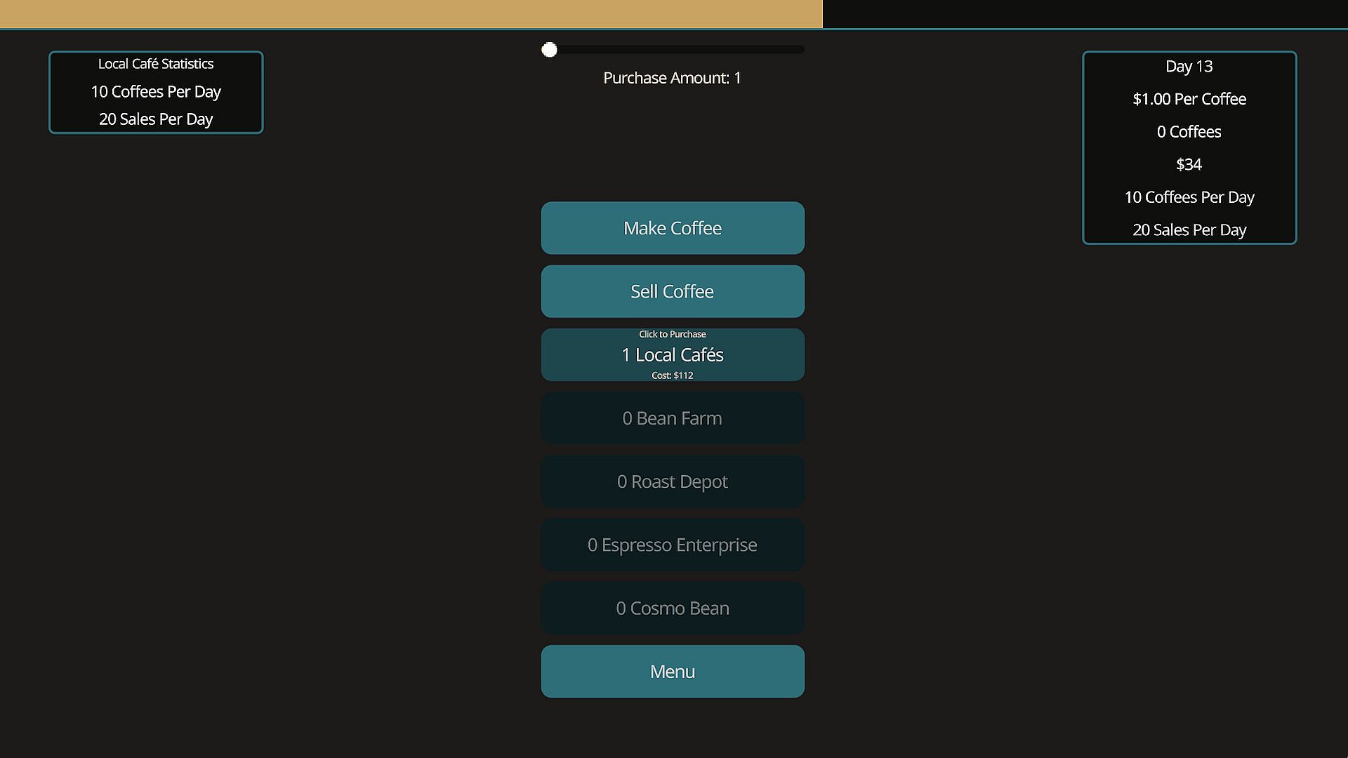 CaffiNation is a game about making and selling coffee. You'll advance from owning a Local Cafe to spreading your coffee empire across the cosmos! Your ultimate goal will be making the most money while balancing your coffee production.