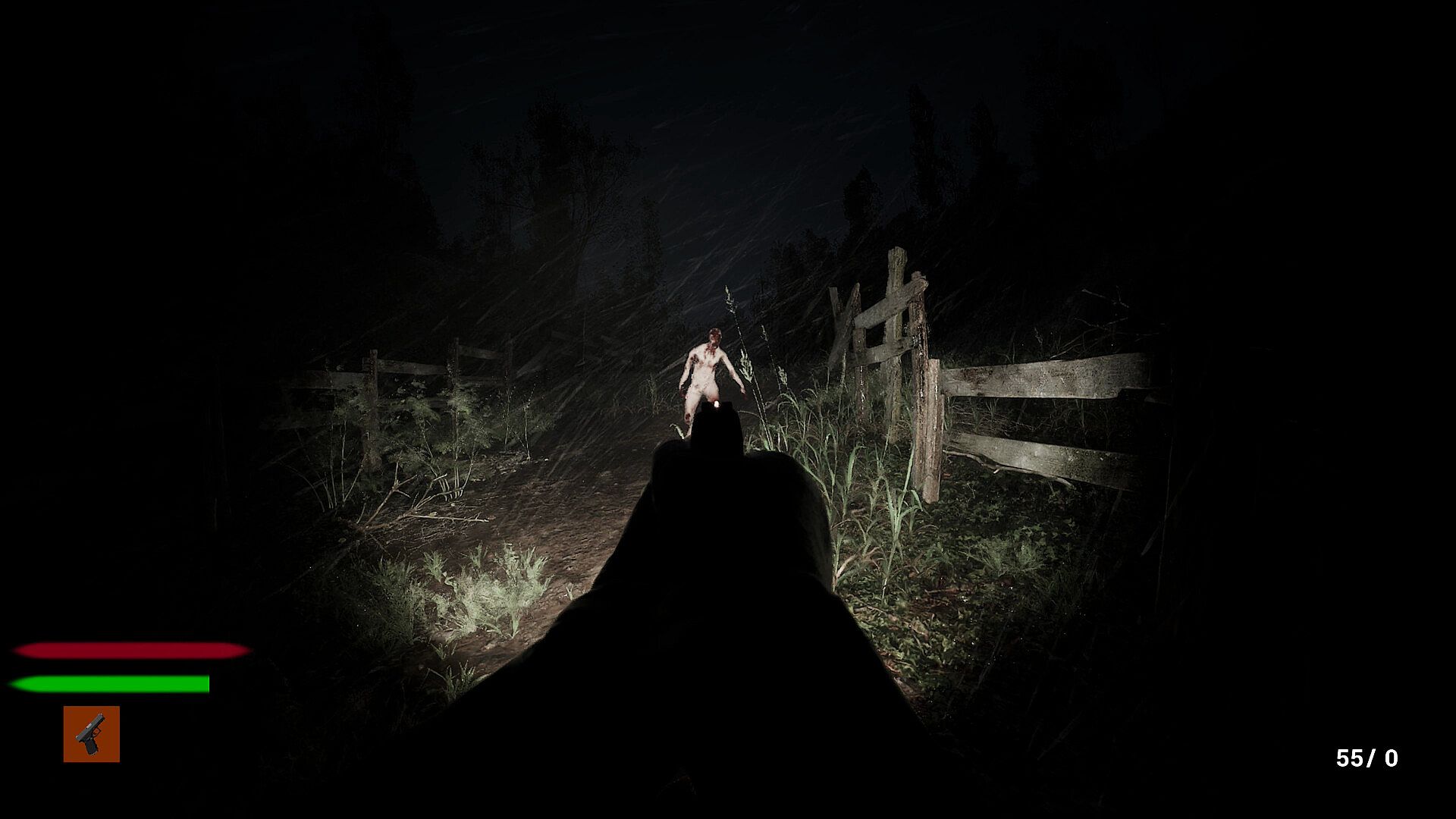 A mix of elements of action, stealth, horror, survival and in a dark rural horror setting.