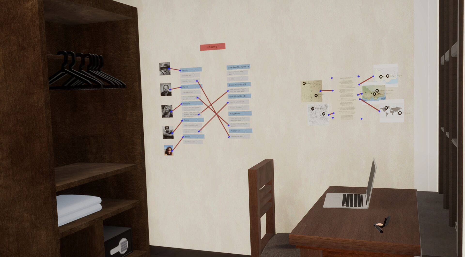 Use your deduction board to connect the dots between the evidence you’ve gathered through searching the in-game internet and by exploring the local environment.