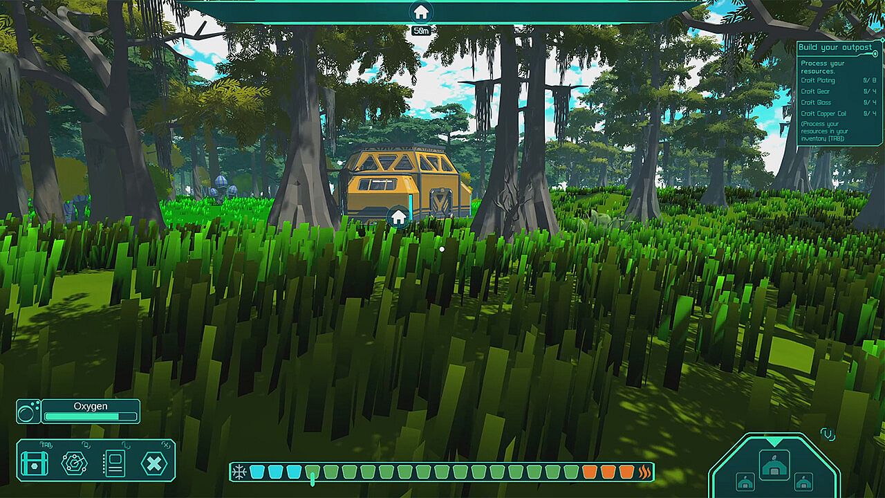 Utilize M.A.R.S. to locate resources and gather them with your advanced tool arm. Collect biological matter from creatures and process fluids to acquire improved raw materials, enhancing your productivity.