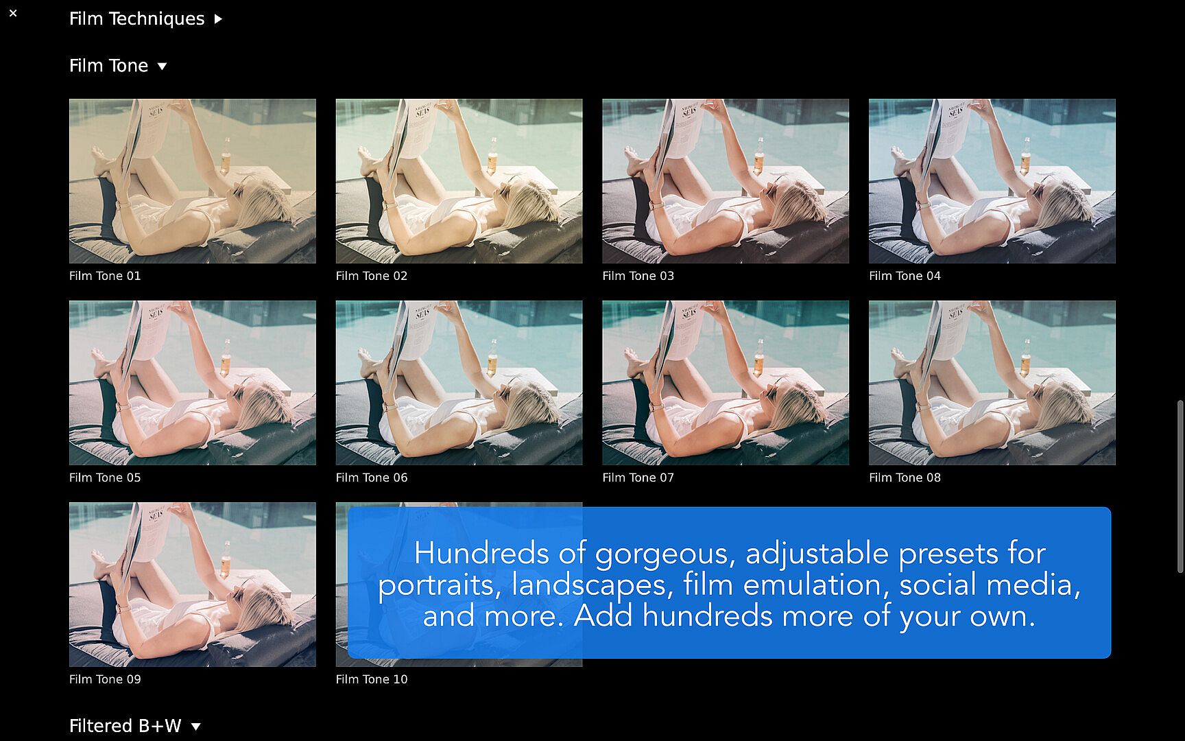 - Easily apply and adjust hundreds of filter presets, plus make and share your own