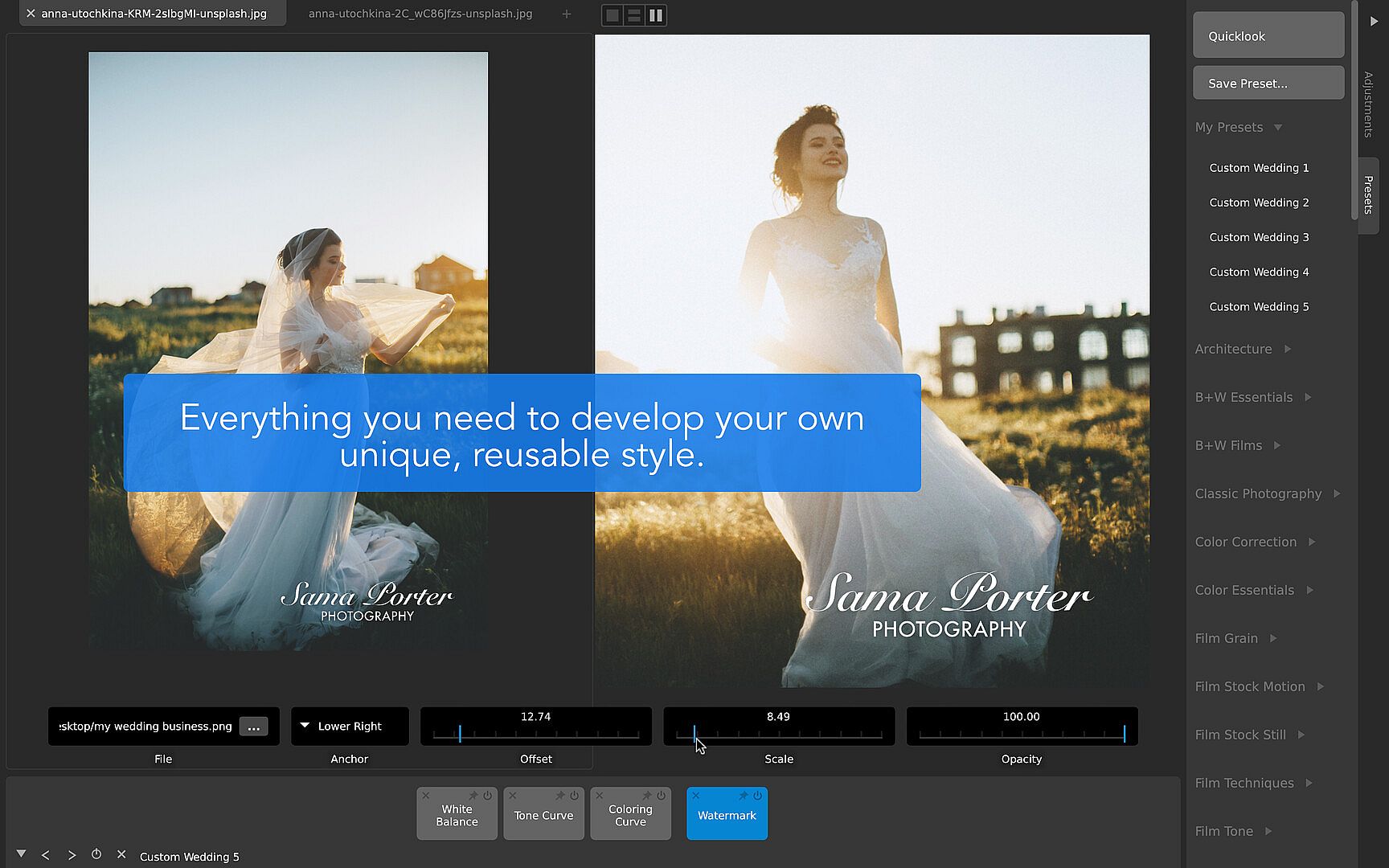 - Tons of useful presets for wedding photography, portraits, landscapes, film emulation, and more