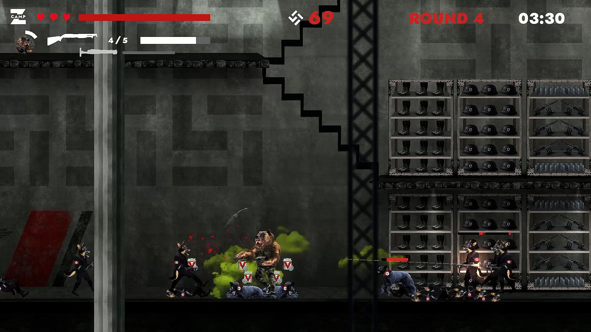 Design: Camp Z is an alternate history, WWII, 2D side scrolling strategic shooter. The design of the levels and characters is a unique collage style art that is paired with a simple user-interface and bold typography. You will have two primary weapons, a melee, and a special. When playing on a controller (X-Box recommended) the controls will feel comfortable for those used to playing FPS games. The game features a custom soundtrack that was designed for the rooms and story themes of THE AWAKENING. It also pairs with the escalating intensity of DEFIANCE MODE and changes tracks as you progress higher and higher in rounds, the most difficult rounds feature the main theme song.