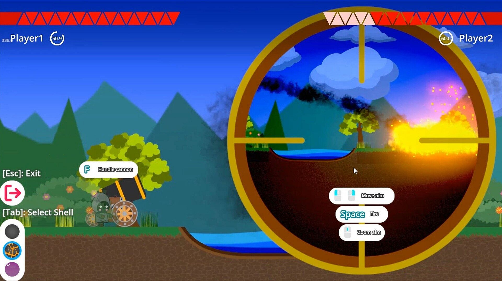 A 1-on-1 turn-based strategic shooting game themed around cannon bombardment. Strategically use shells and terrain to strike your enemies and claim victory!