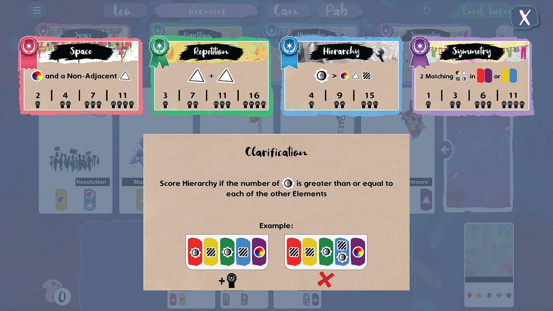 In Canvas, you combine transparent Art Cards to create unique paintings, with each card adding elements and icons that shape your final score. Strategic choices about which cards to layer, and which icons to reveal or cover, are key to meeting scoring conditions and earning ribbons. Each painting contributes to your score while also becoming a one-of-a-kind masterpiece with its own title.