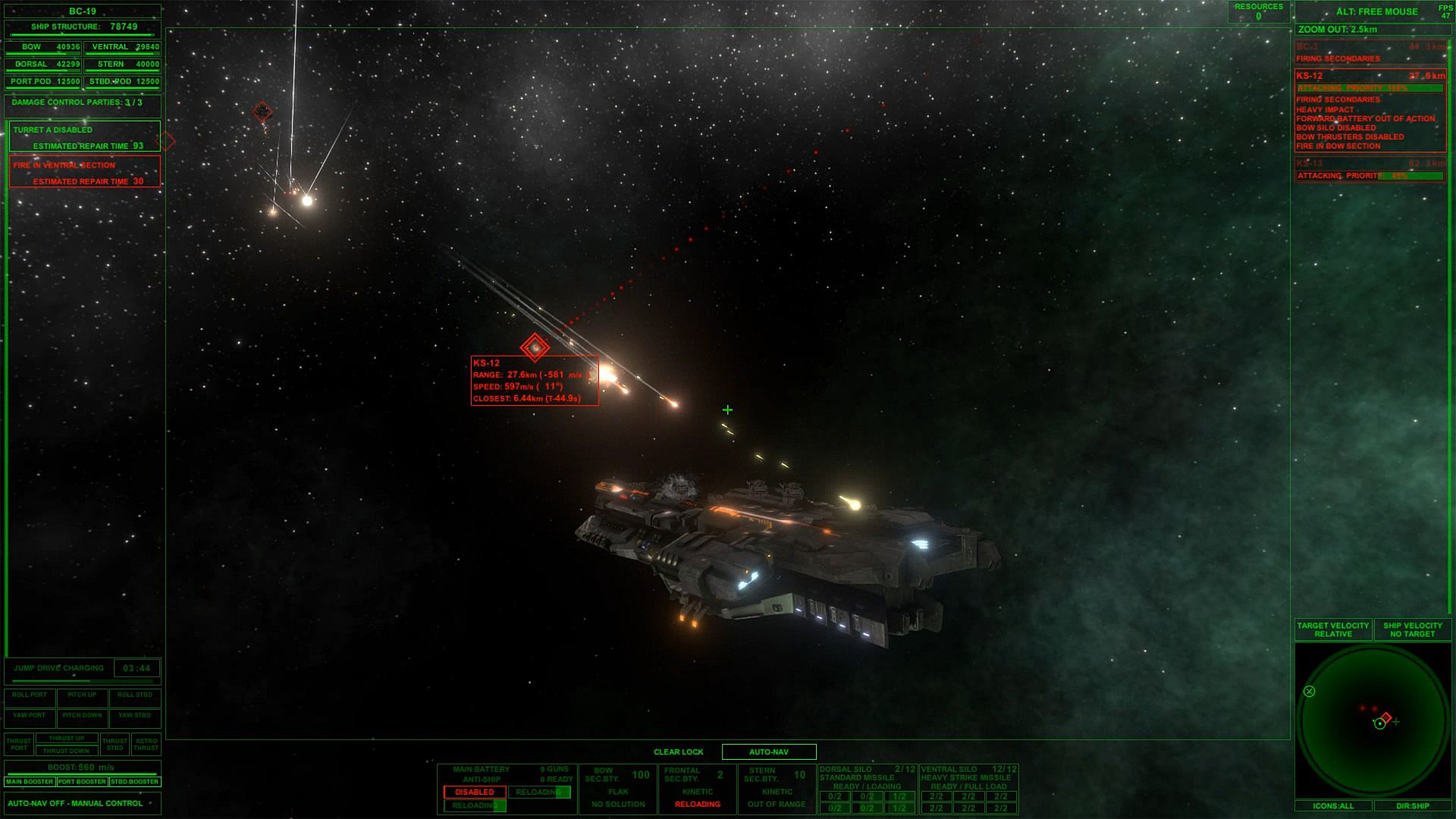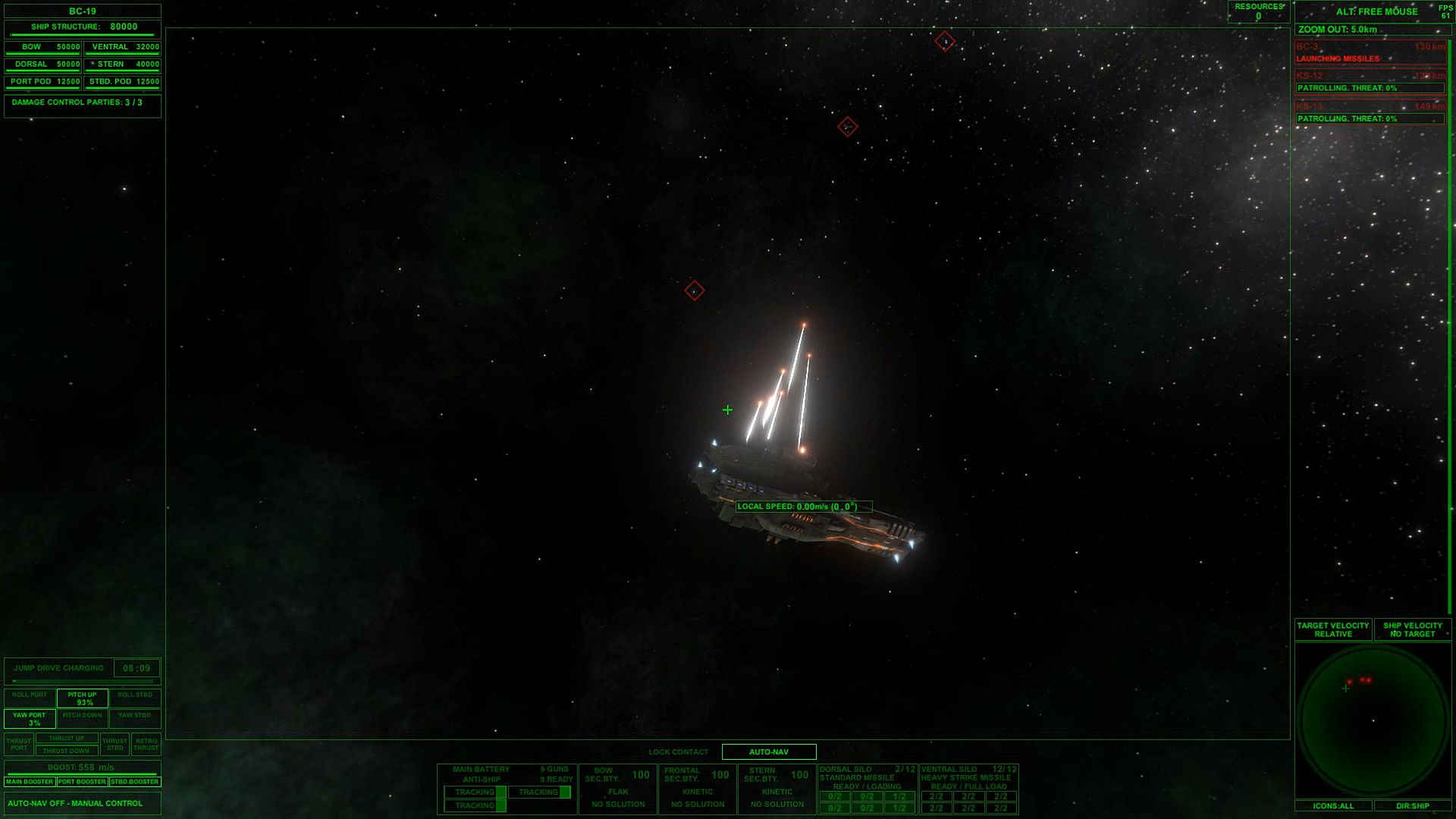 Adjust your angles to make sure the right weapons can hit the right targets. Position your point defense turrets to lay down a protective screen against incoming missiles, while your own missiles and solid projectile salvos return fire.