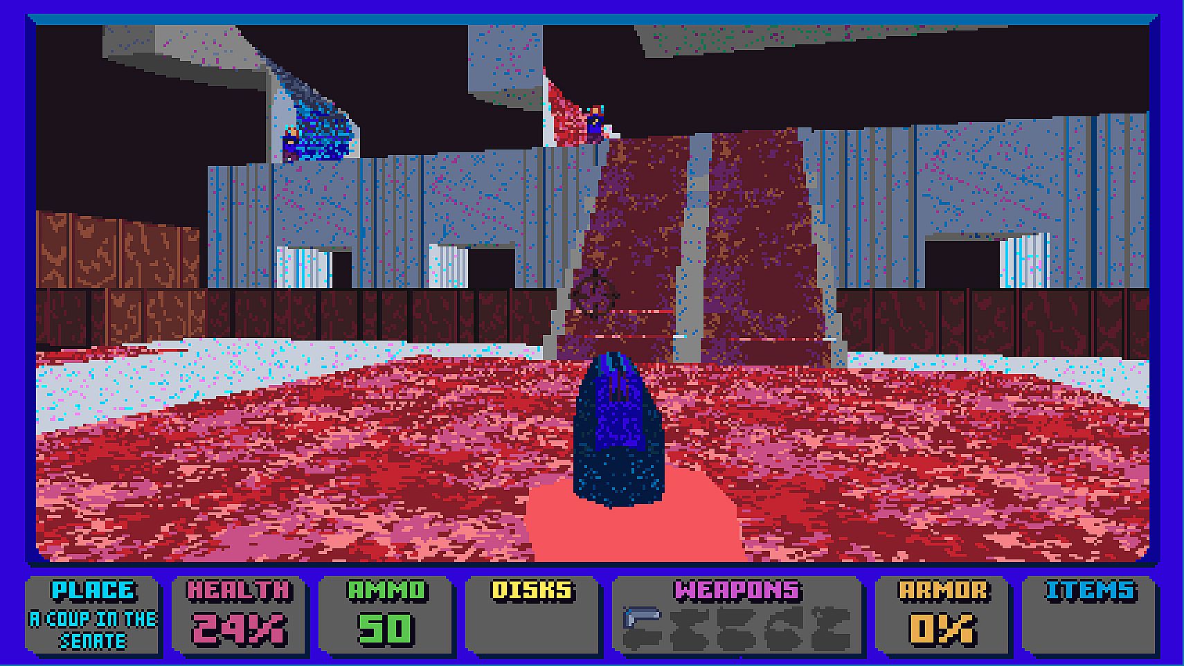 Module-based music, authentic 8-bit sound fx and 15fps particle effects to harass your ears and boggle your mind. 90-degree walls, slopes, environment contrast, reflective mirrors, underwater swimming and hazardous areas all in incredible, eye-popping 6-bit color.