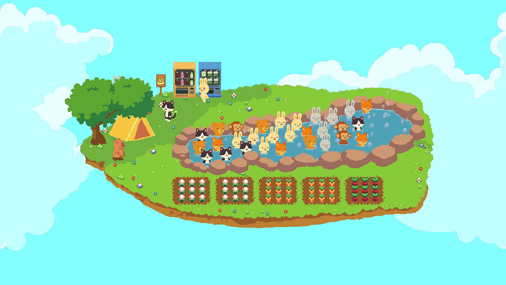 -Upgrade hot springs, place vending machines and food stalls, and place a variety of charming decorations to personalize your island and make it even cozier. As your haven grows, more animals will arrive to bathe, relax, and support your gentle flow of income.
