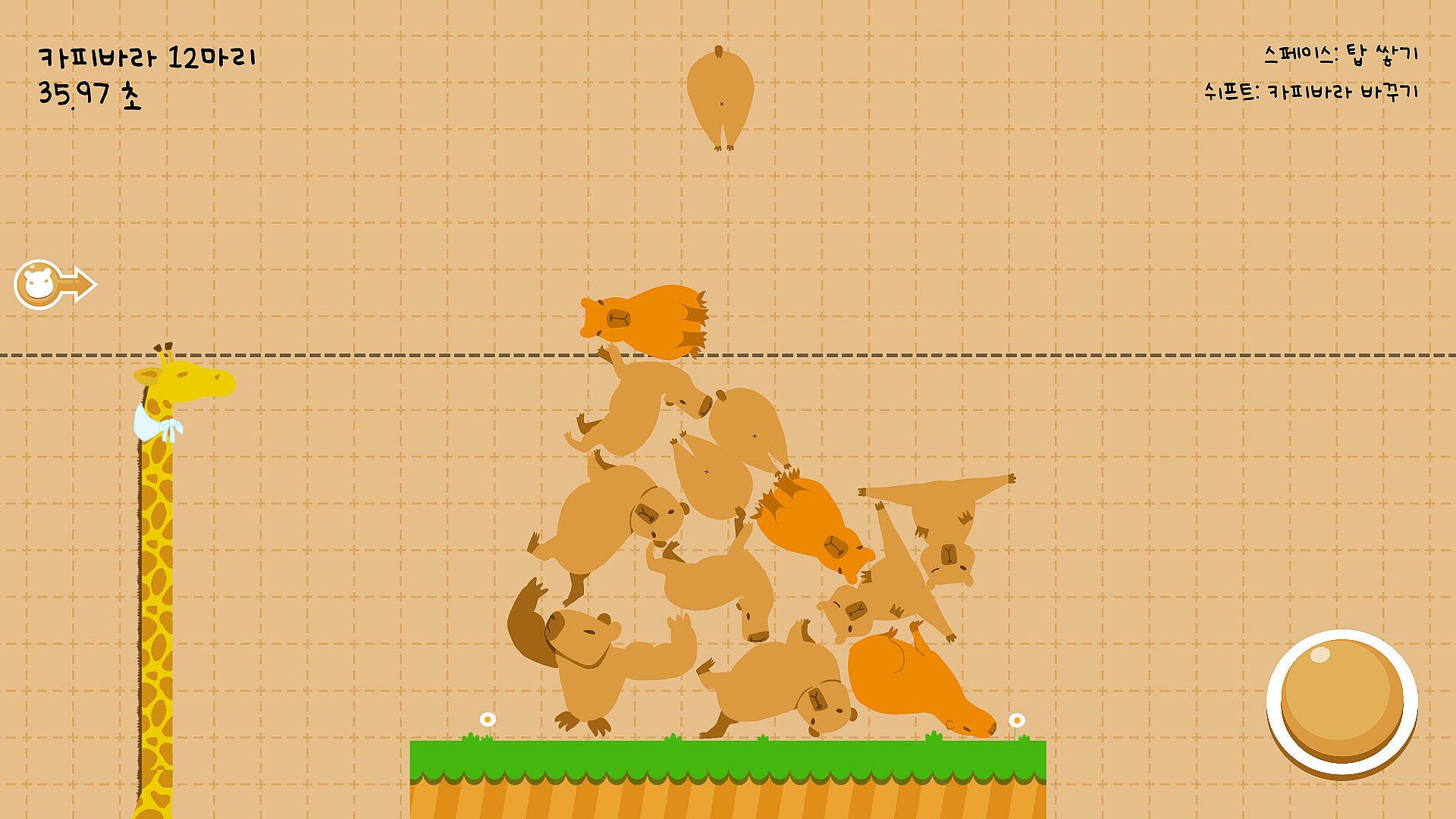 - Time Attack Mode: The giraffe, the rival of the capybara, has a neck that keeps growing longer. The capybara can't be bigger than the giraffe, but the capybarabarabarabarabarabarabara can! The capybara tower must always be higher than the giraffe. Try to outrun the giraffe and remain the tallest animal for as long as possible.