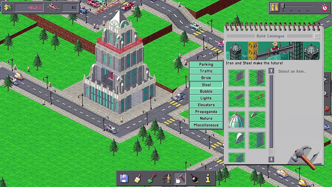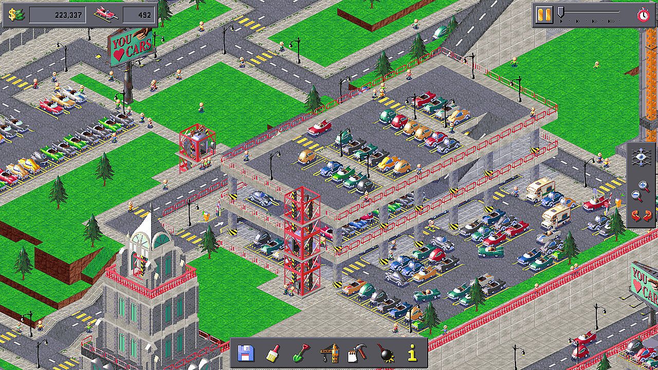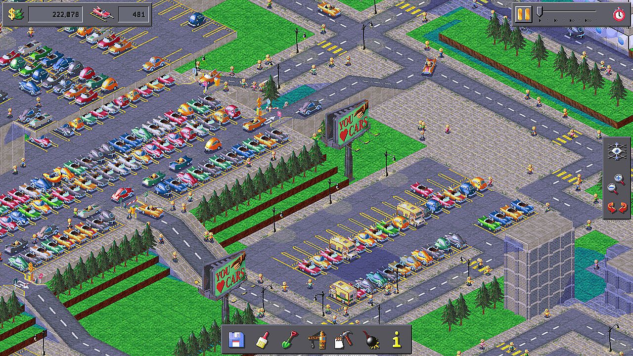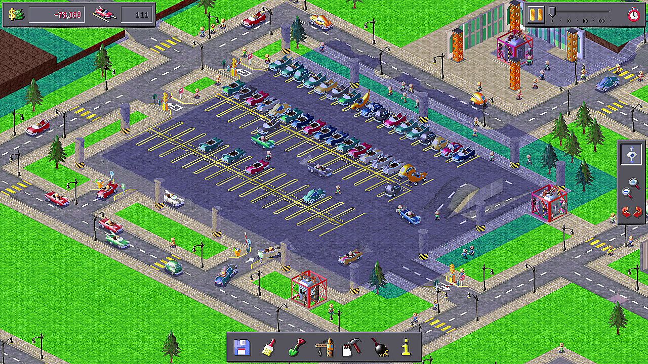 Buy land, demolish homes, and build the parking lots of your dreams: Endless flat seas of asphalt or build into the air using the 3D construction tools.