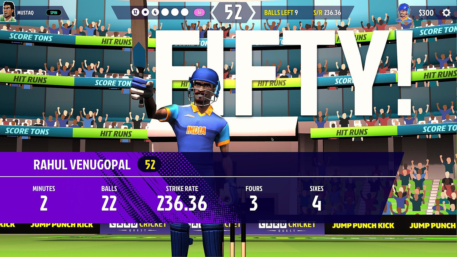 Card Cricket Quest is a cricket-themed roguelite deckbuilder about matching cards, smashing runs and blasting tons in your quest for sporting glory. Ignore boring responsibilities like setting field positions, managing bowling line ups, or waiting for the pitch to dry out -- this is a curated cricket experience about YOUR solo batting heroics, and becoming a batting legend, one run at a time.