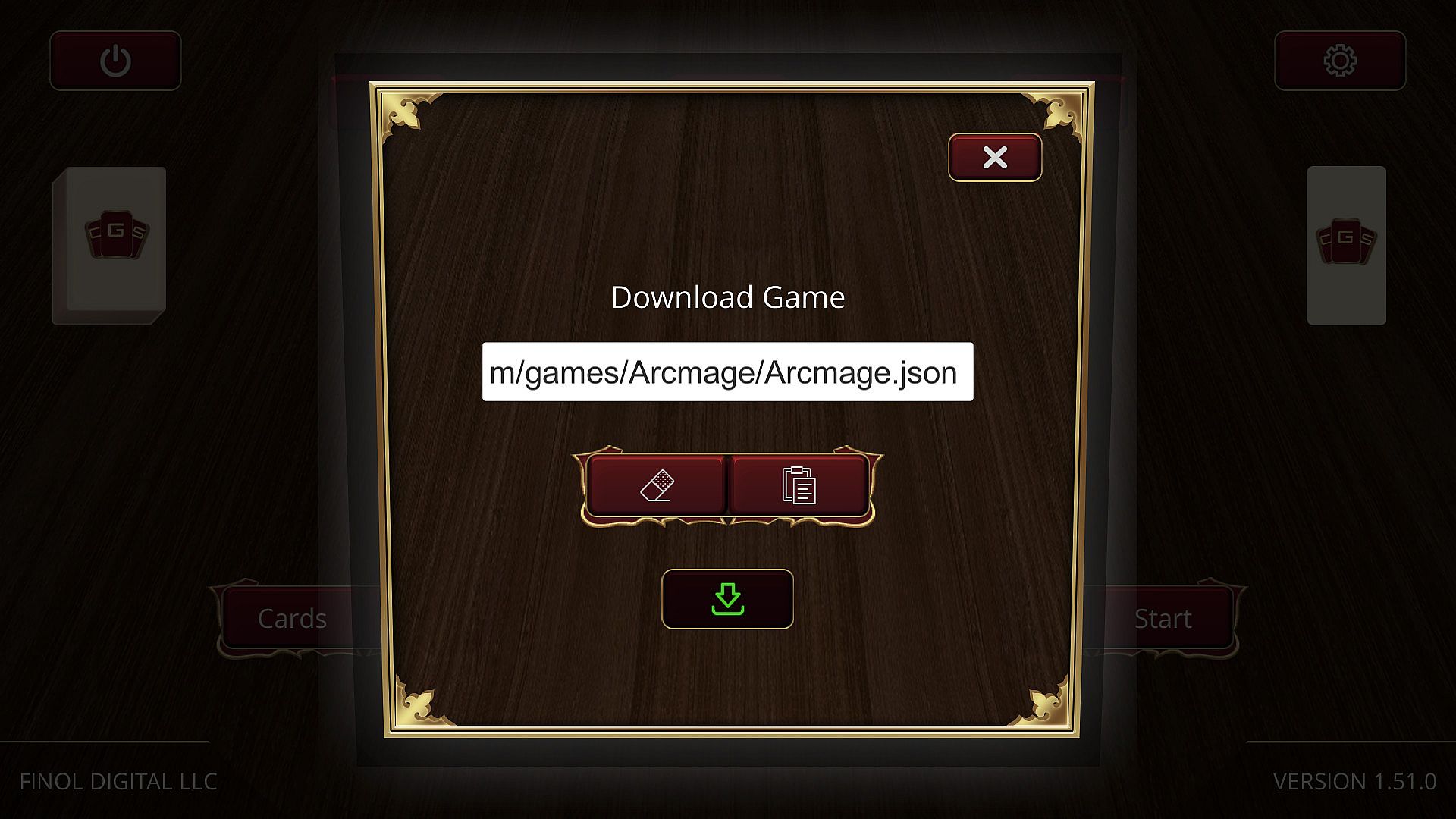 You can download additional games by selecting the center card game in the Main Menu. Press the download button that appears and enter the CGS AutoUpdate URL for the game you would like to download.