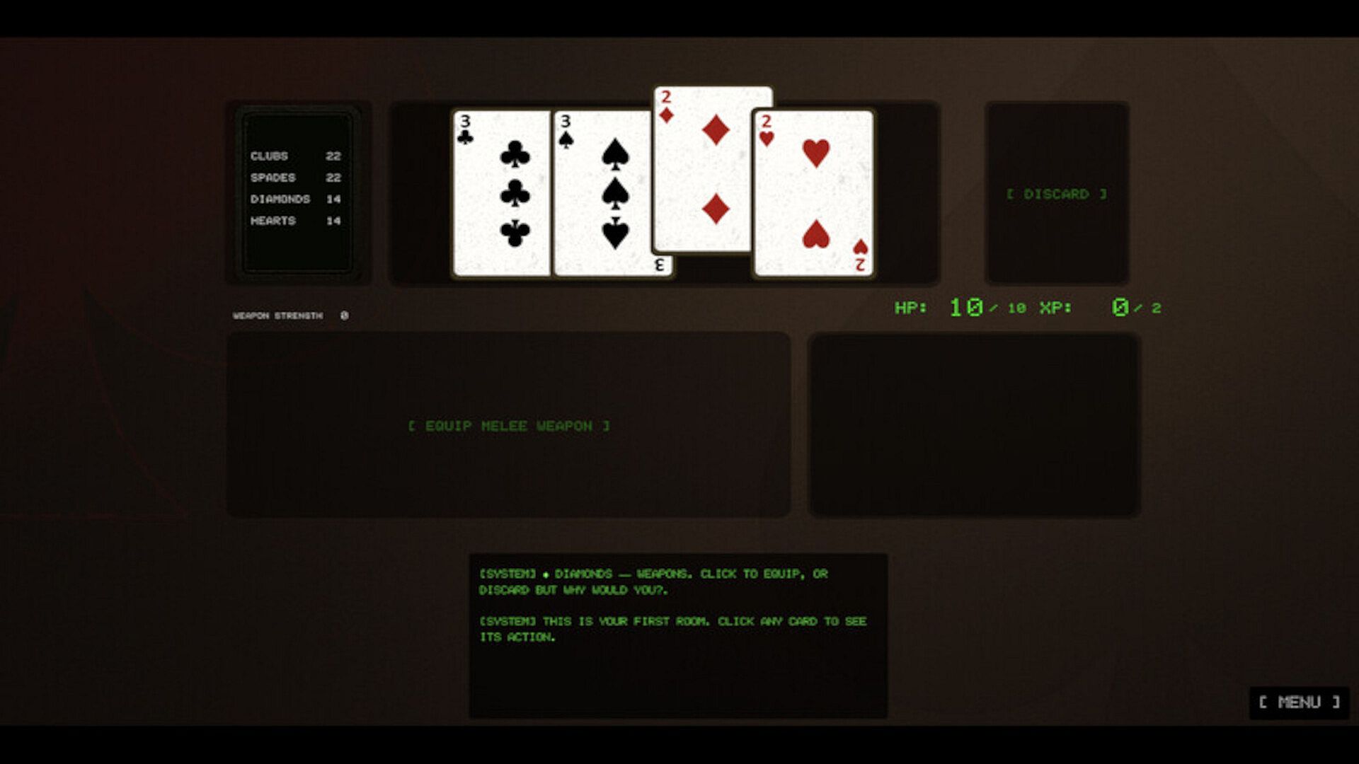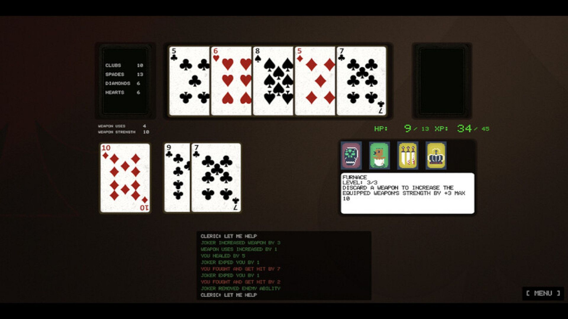 • Weapons (♦ Diamonds): Equip them to fight stronger enemies or discard to empower your current weapon.