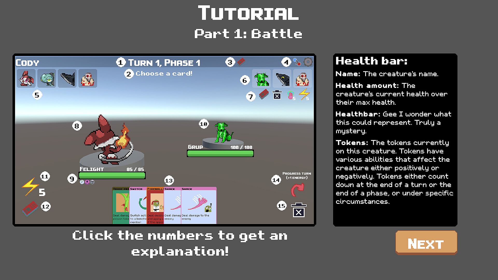 - Held items - these are items that the creature can hold that will give them certain effects in battle, such as being able to use cards not of their type, heal, gain extra energy, etc.