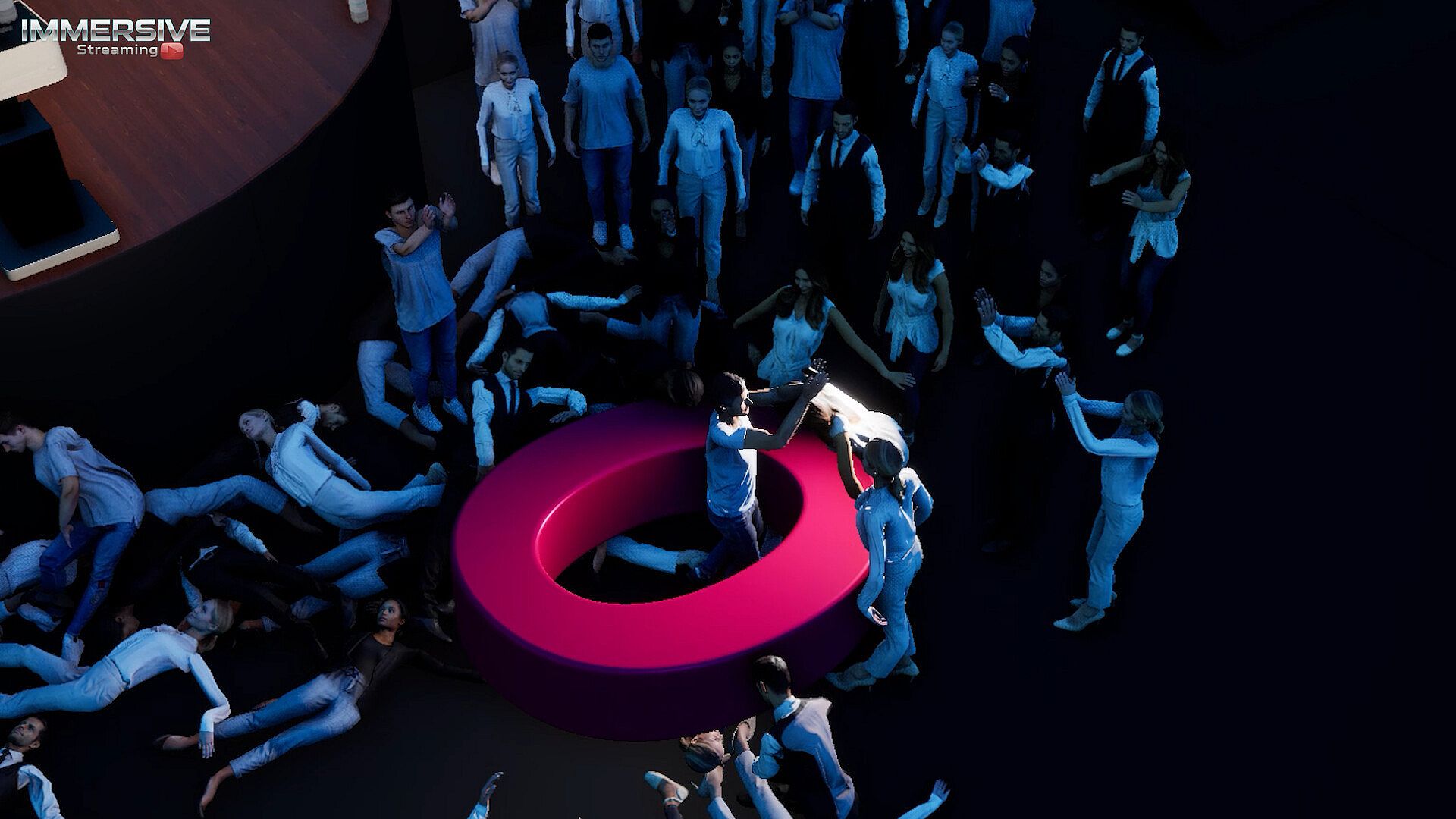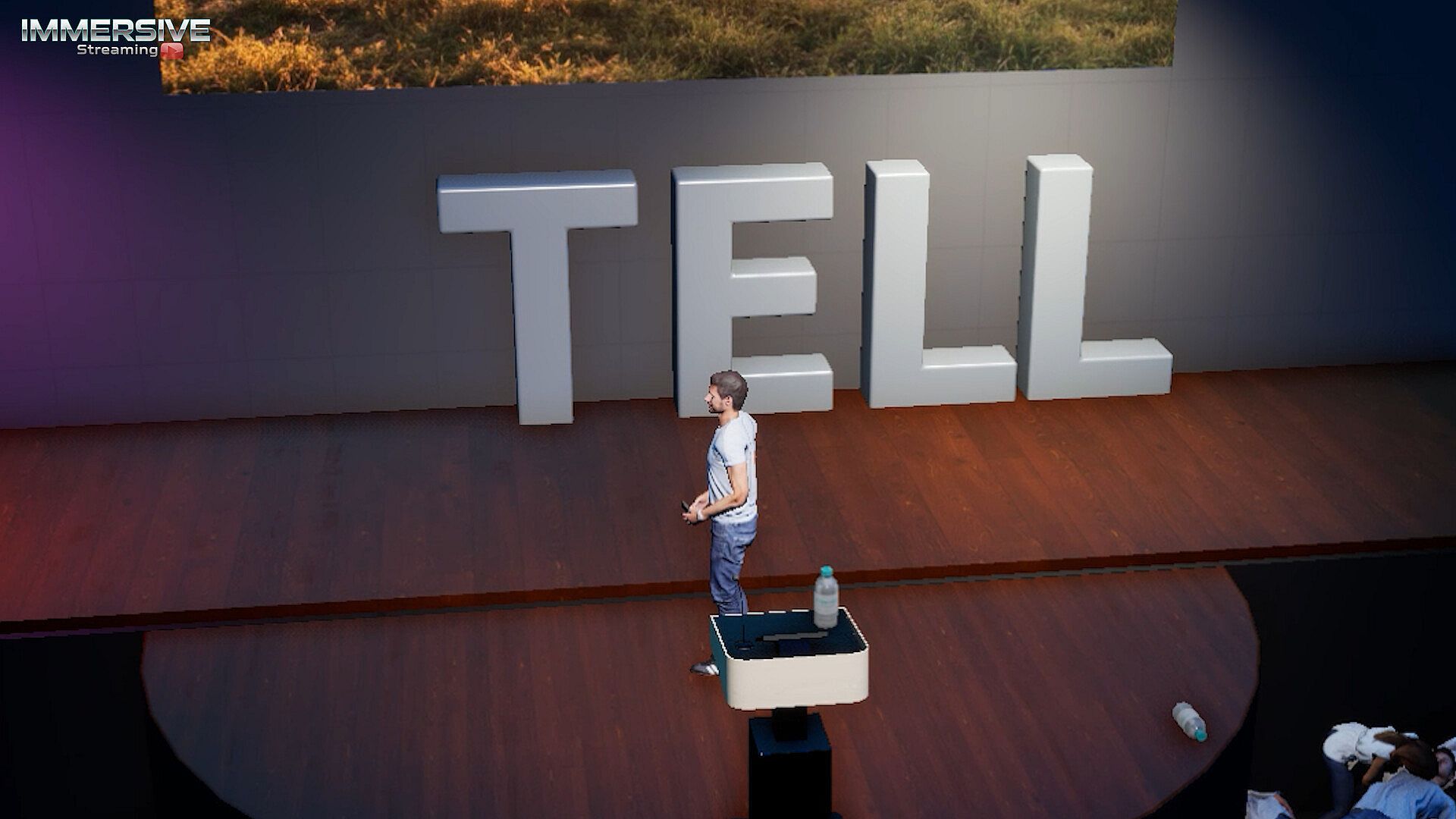 The game begins normally: as you enter the stage, you can clap, dance, and take a bow. You can cycle through the fake presentation slides behind you and even control the camera angles and zoom - just like a live TV broadcast.