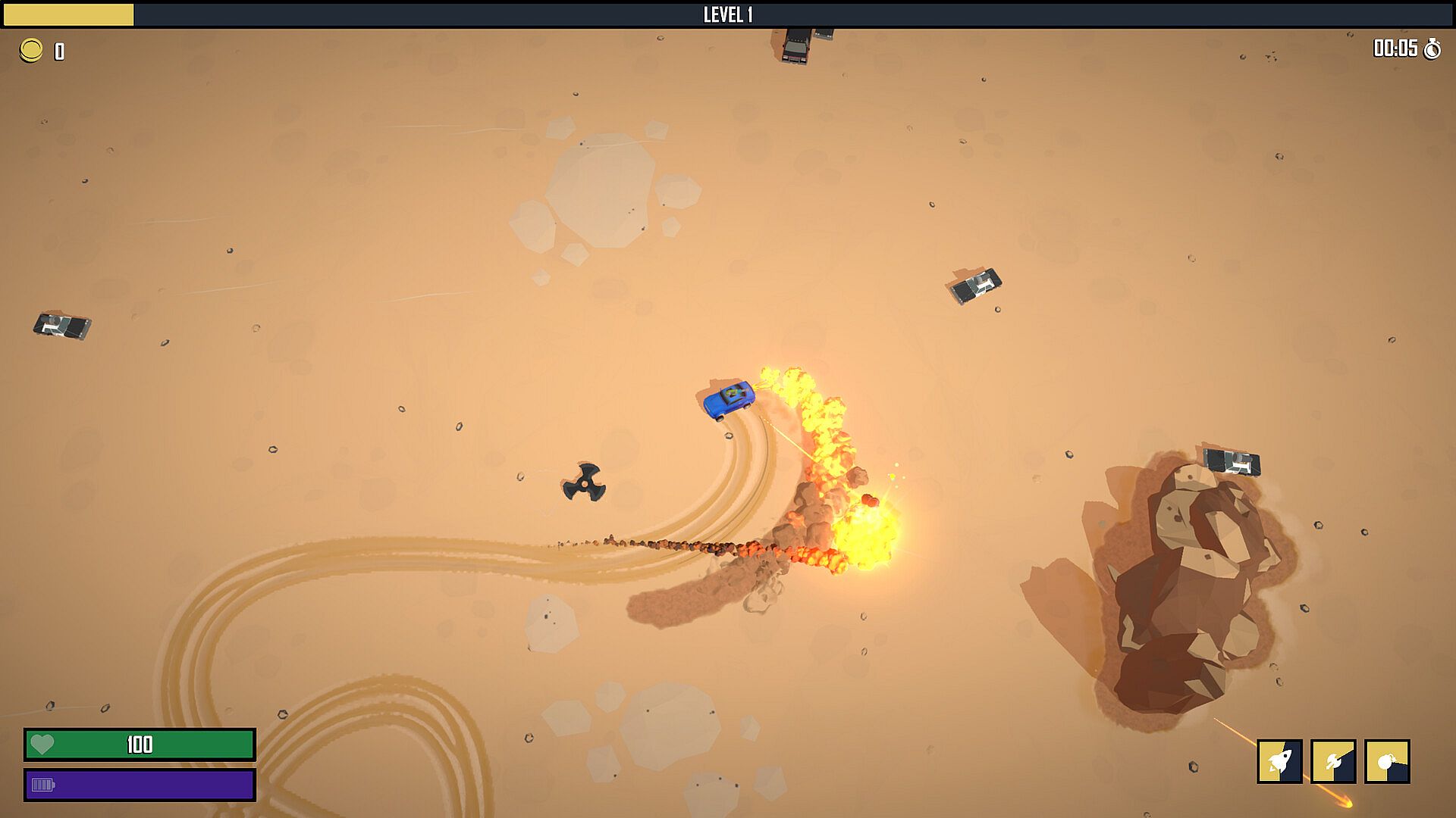 Steering the car ensures your weapons target enemies effectively; weapons operate automatically, with some locking onto targets while others fire continuously.
