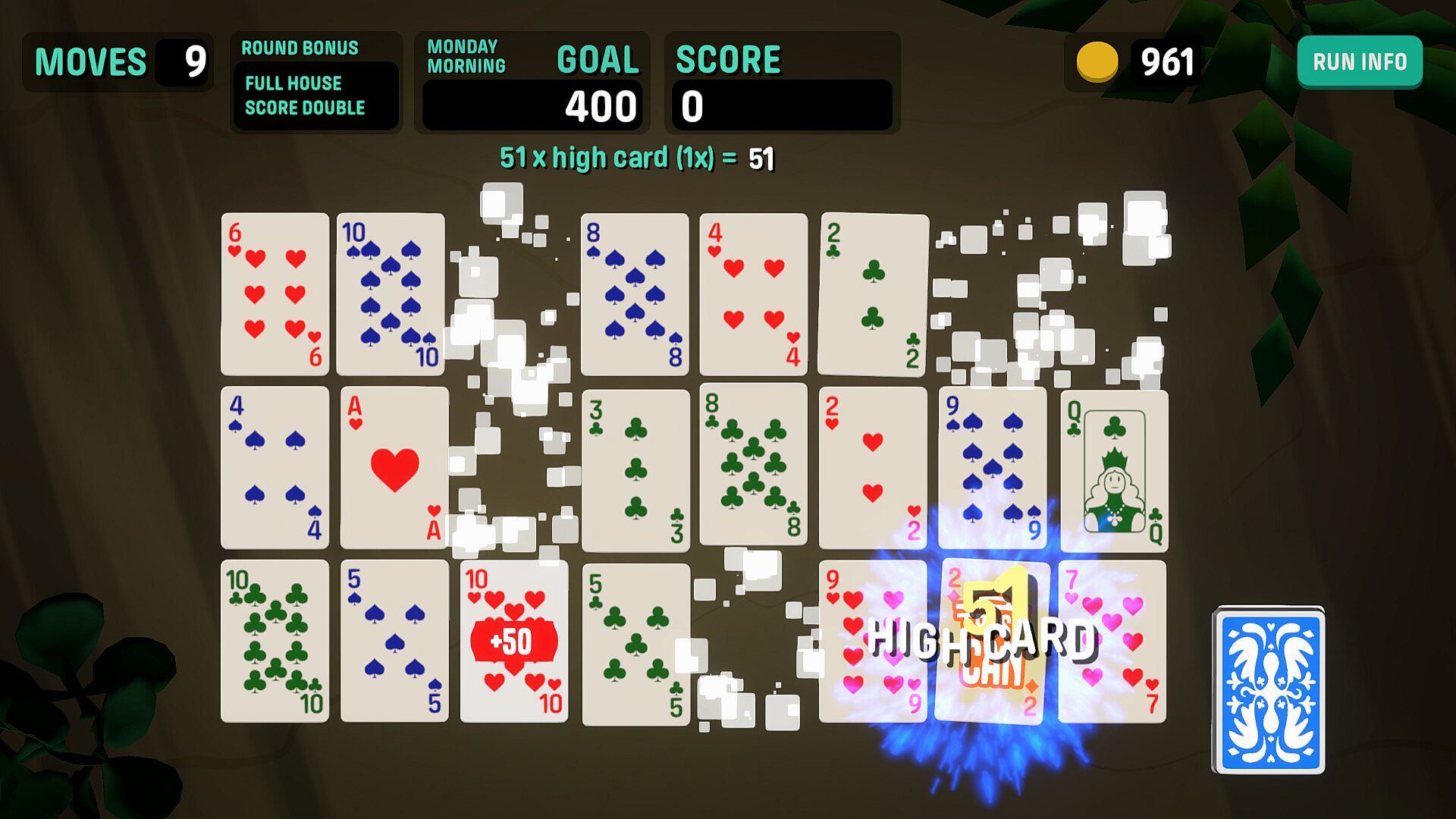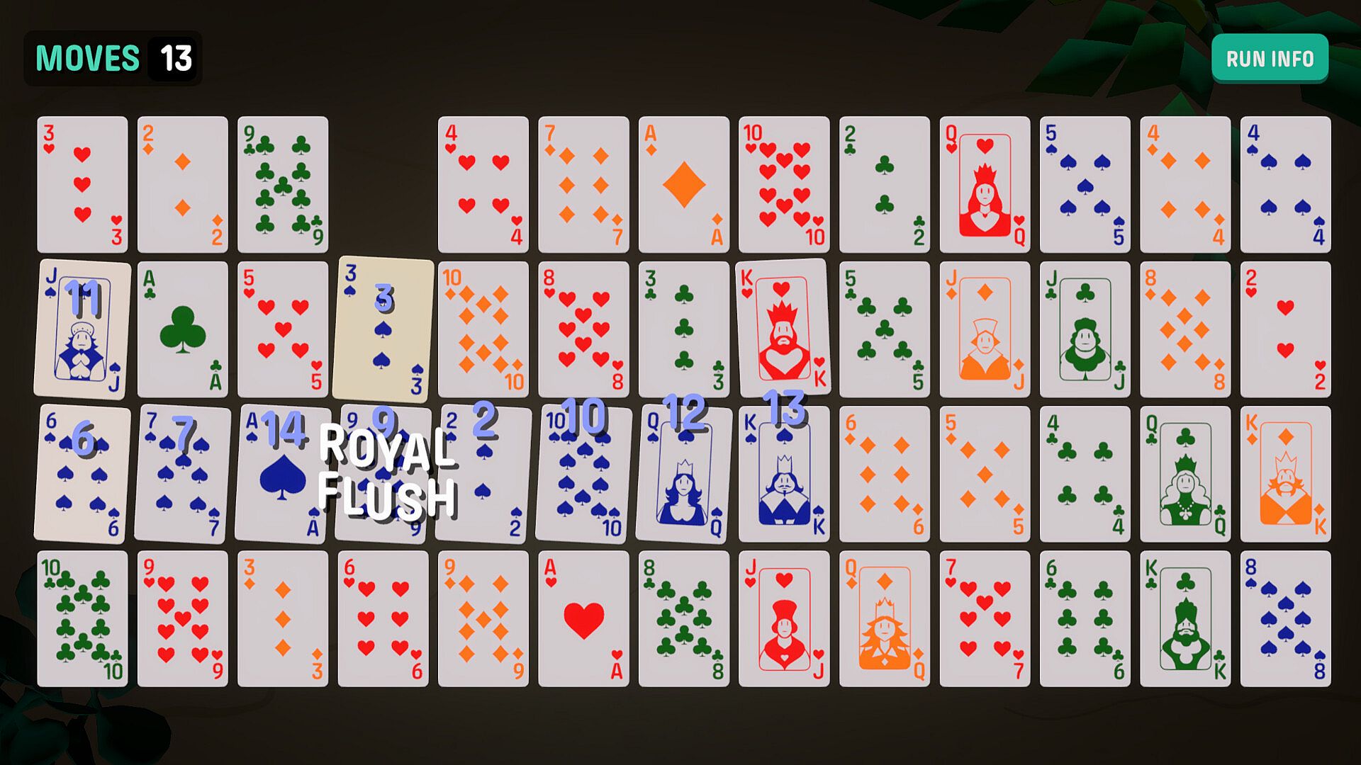 Playing Cascadou is easy! Clicking a card automatically plays the connected poker hands, but with limited moves per round you need to plan, create and execute the biggest scoring hands to survive for seven days.