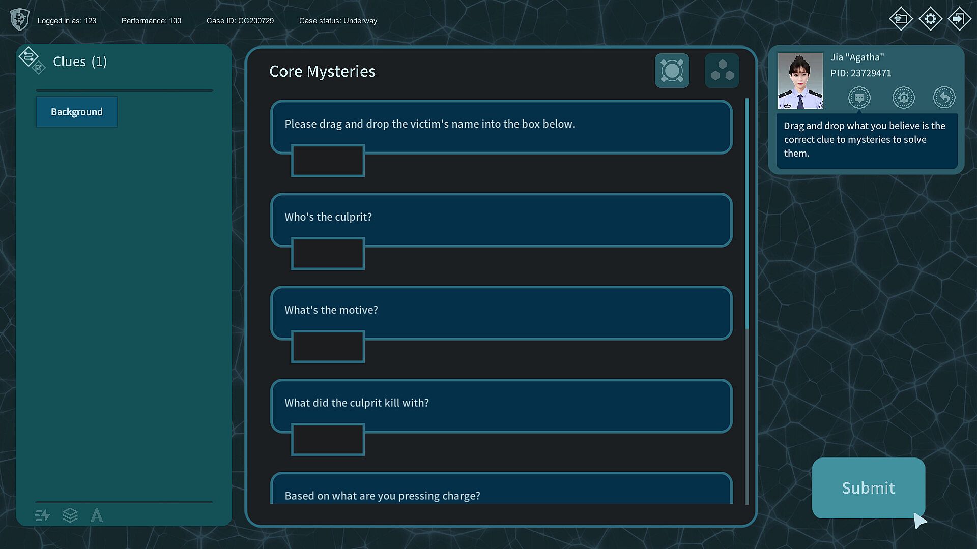 After you have solved all the cases, Chicheng police will give your final evaluation based on the detection points and your performance.