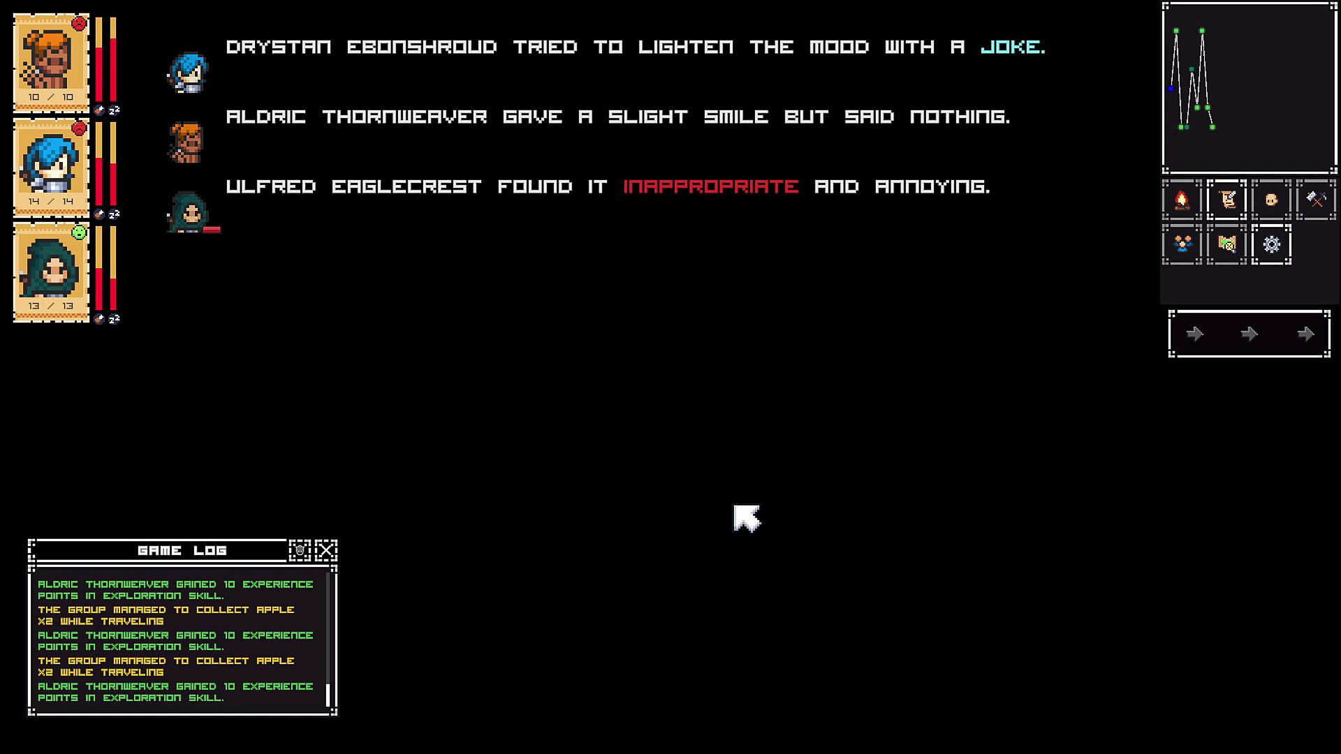 Manage your resources carefully: food, rest, and shelter are key to survival. Engage in turn-based combat with tactical depth, make choices that shape the story, and lead your party through an adventure where no two playthroughs are the same.
