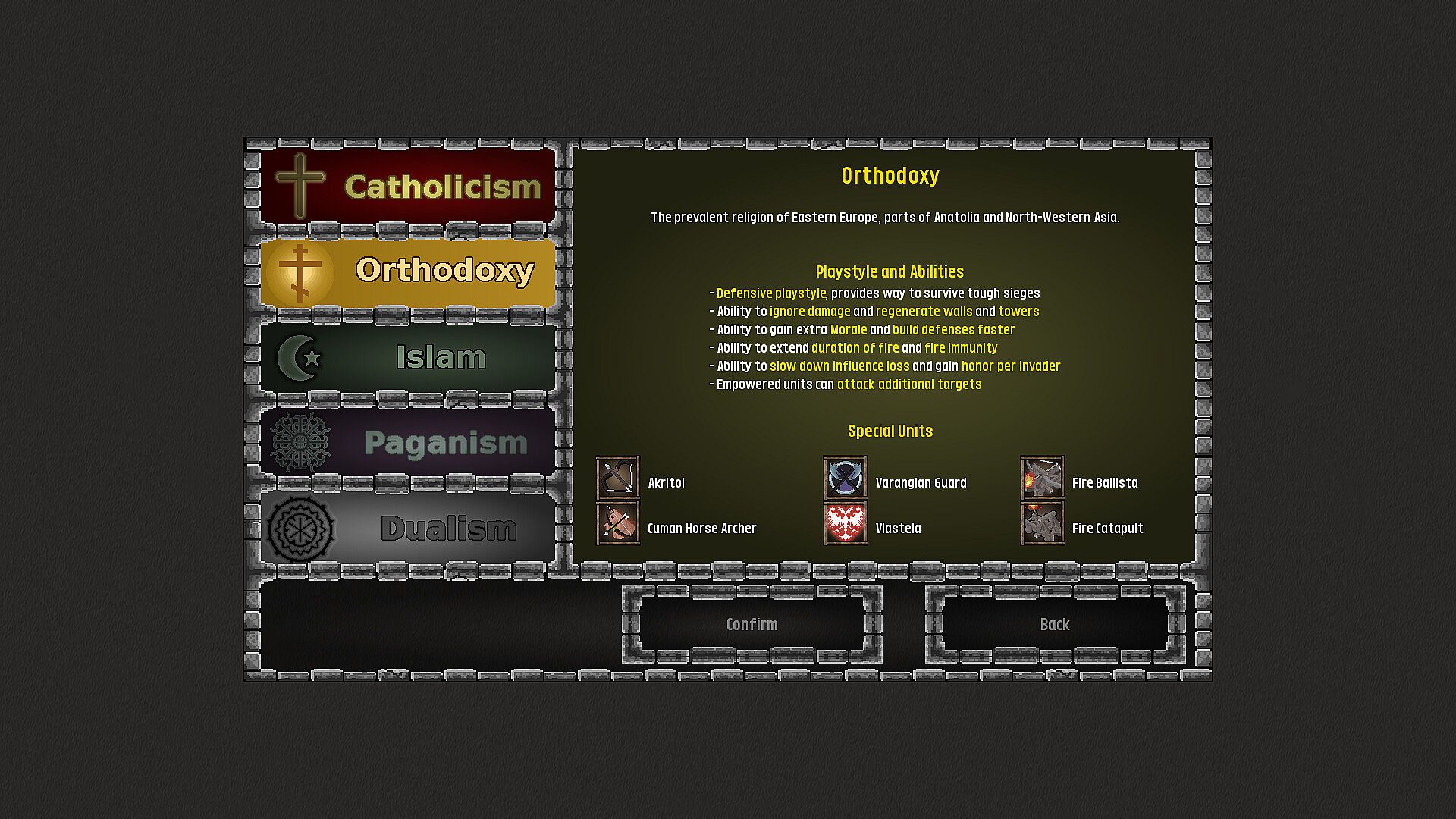 • Over 30 different units - from the basic Spearmen and Archers to the powerful Templar and Teutonic Knights, hasty Horse Archers, elusive Assassins, mighty Varangian Guards.