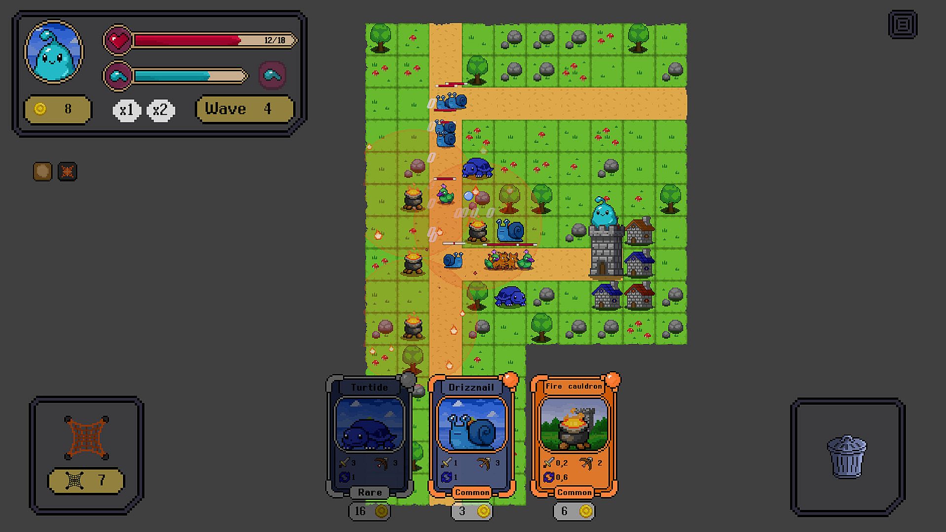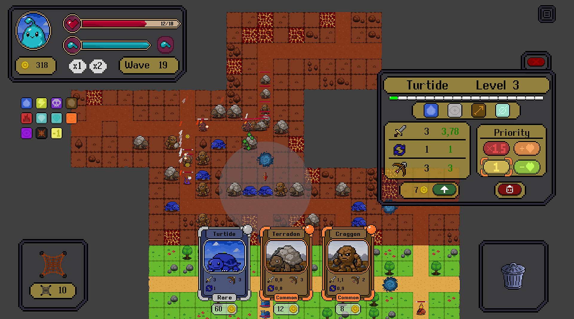 Before each wave, you’ll have the chance to expand the terrain, creating a map that grows larger and longer with every step, forcing enemies to take more challenging paths. Each expansion is generated randomly, ensuring that no two runs are ever the same. On top of that, biomes can change from match to match, altering both the look of the environment and the types of monsters that appear. Every attempt becomes a truly unique experience.