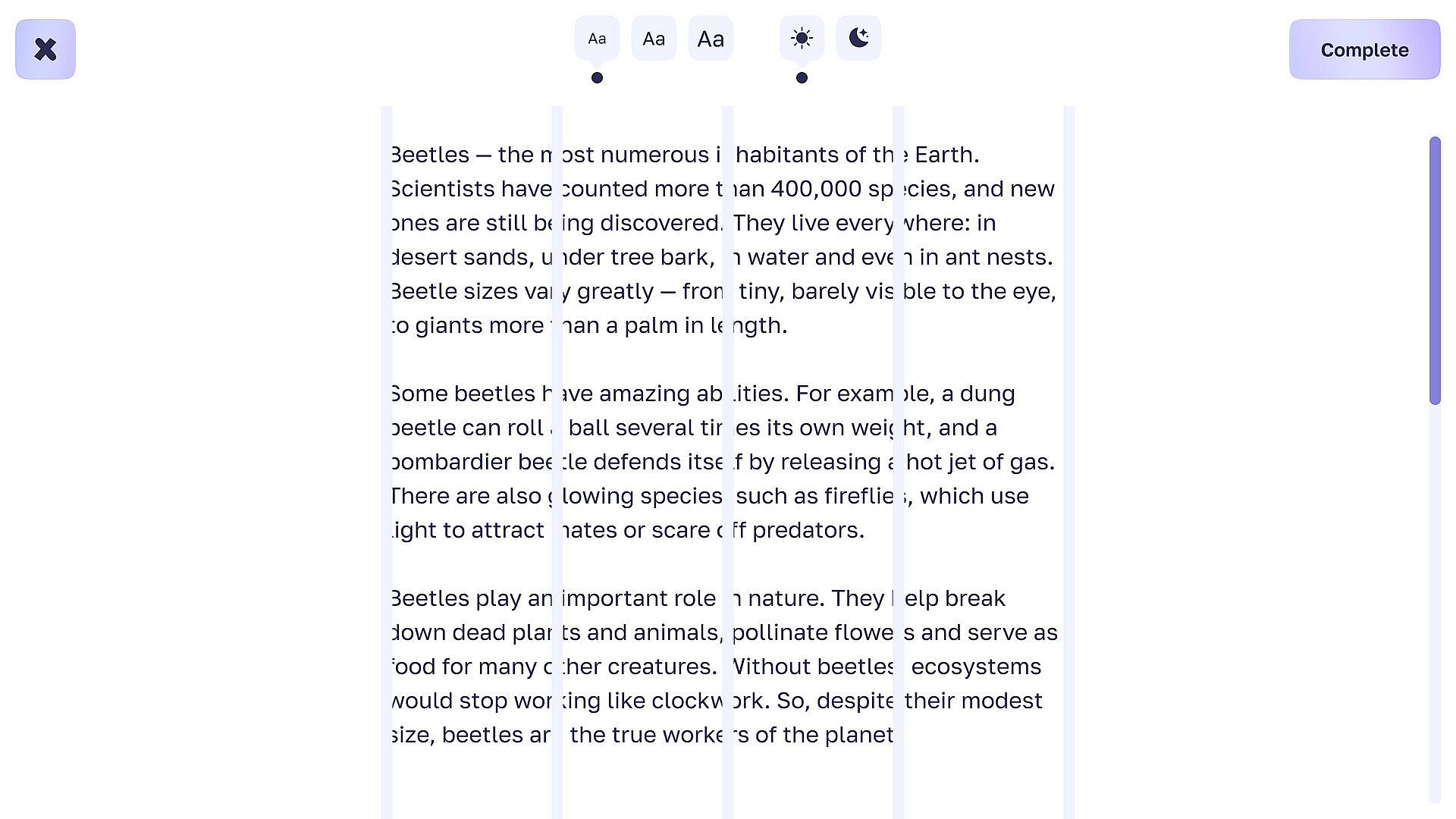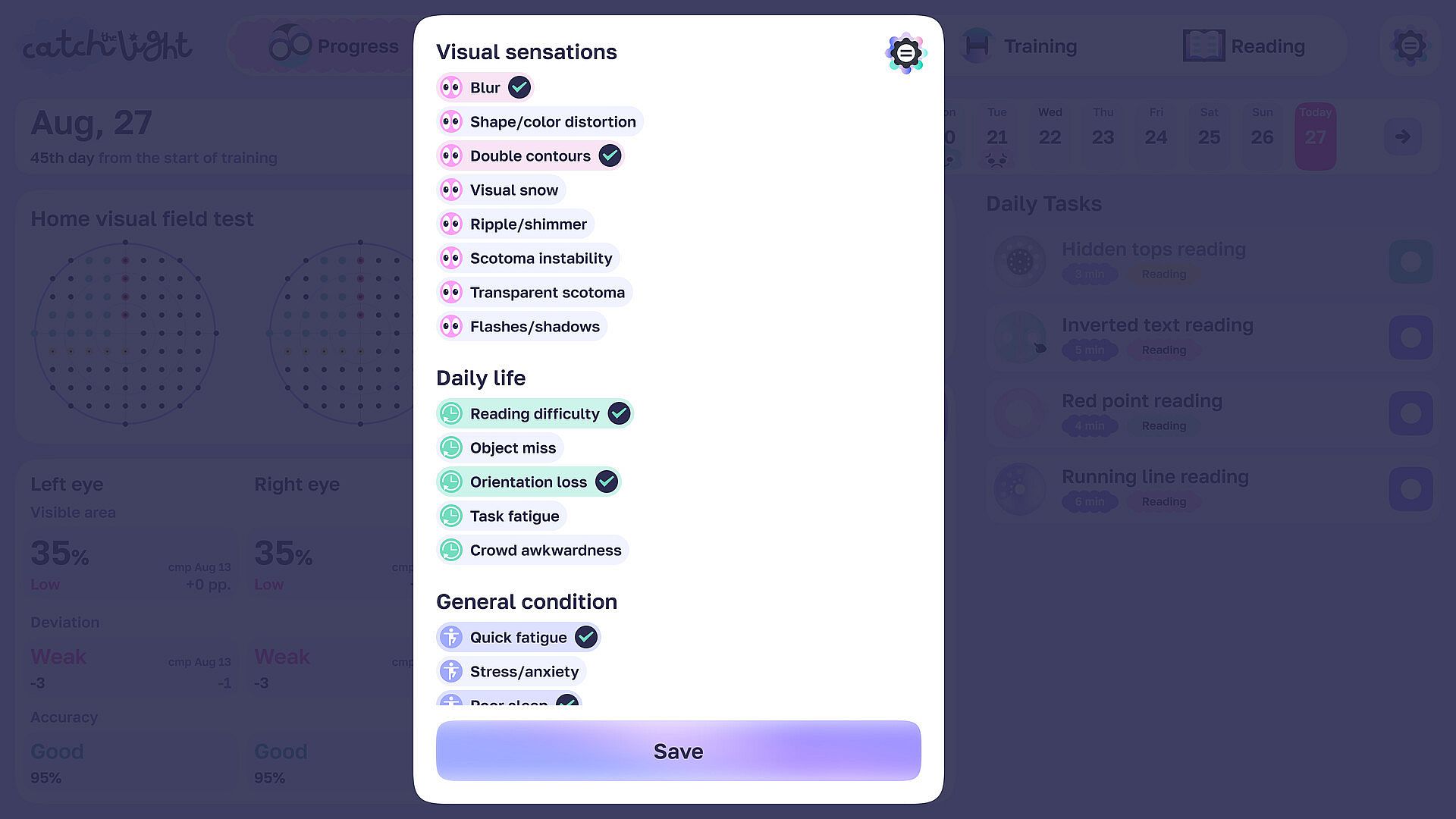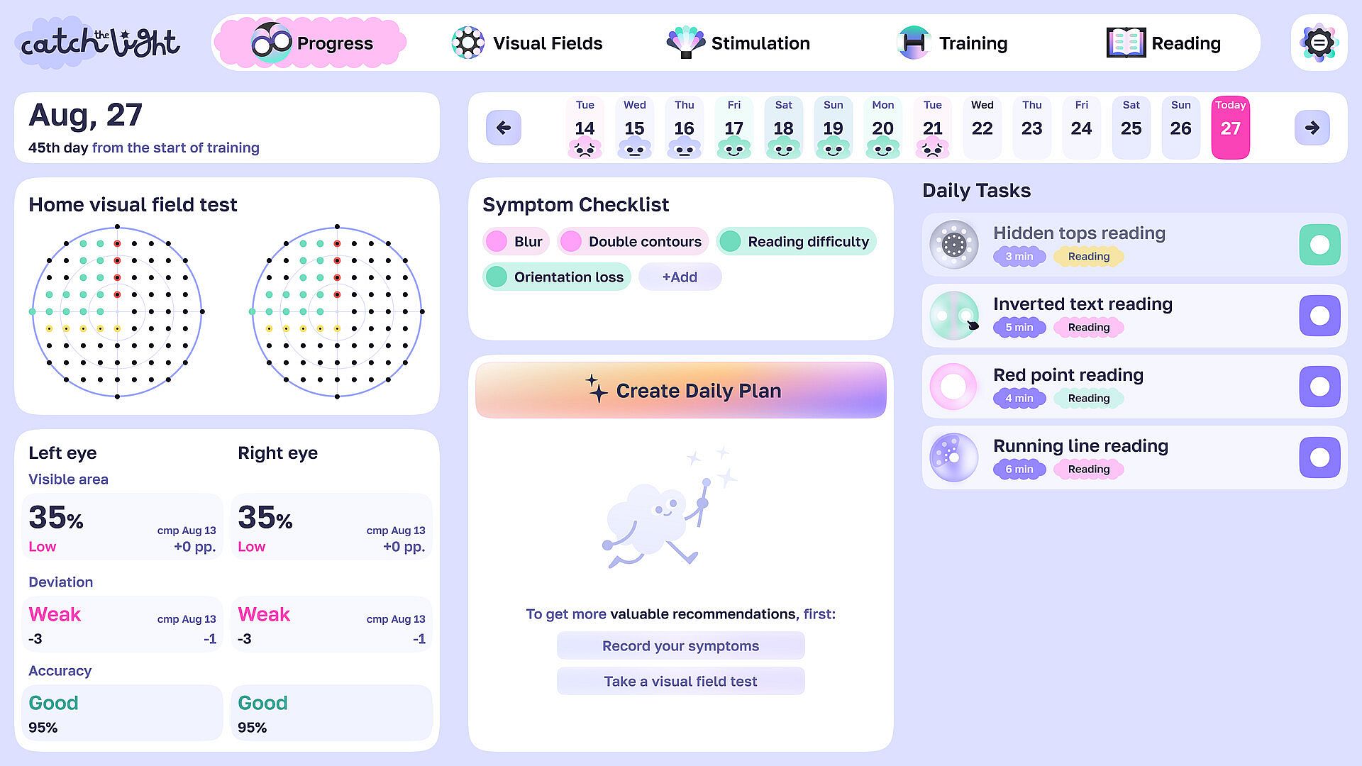 Catch the Light is a gentle home training app for vision and reading. Short, focused sessions help develop perception, attention, and confidence while reading. Designed for adults who want to strengthen visual habits and make practice part of their daily routine.