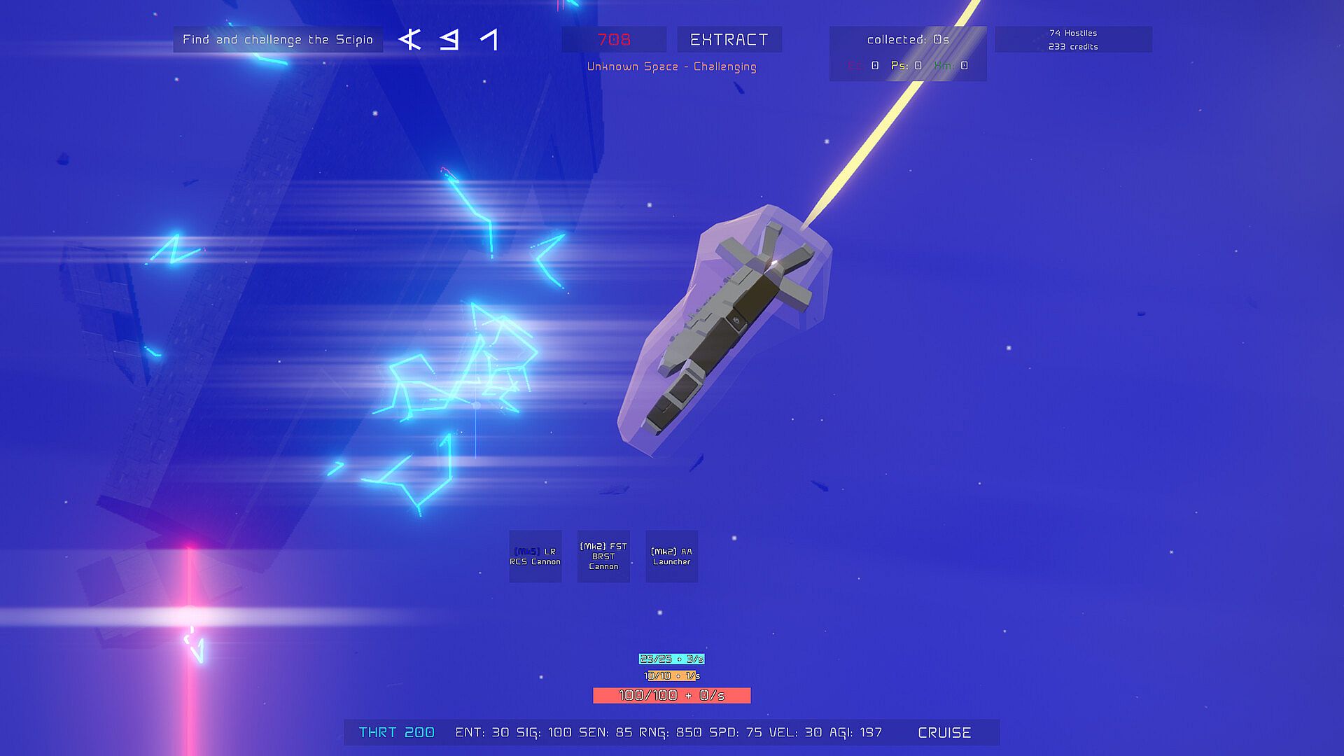 In Catharage, you pilot a single, large ship through space. Your ship is equipped with weapons and modules that you can use to engage enemies (or evade them). You'll find randomly generated loot that you can equip or scrap for currency. You will complete missions for Catharage station, earning valuable credits. Should you die, all is lost - but return home in time, and your reward is saved. Use what you recover to upgrade and unlock ships, hire fleet members or pay for one-time bonuses, to face tougher enemies and go further.