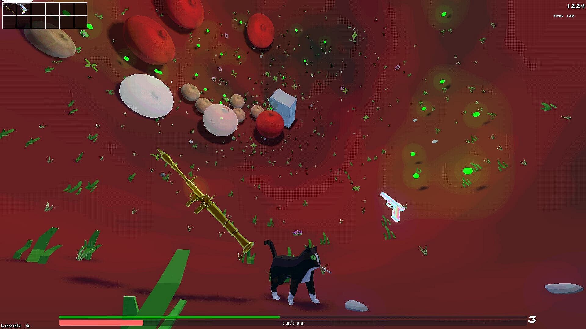 You (a cat) wake up inside a grassy ball with a gun. Onions start sprouting up from the ground and she has two choices: kill or be killed. Survive for 21 rounds to escape this grassy onion ridden hell.